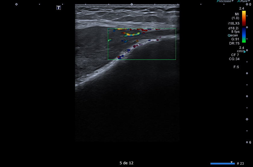 Masa sólida de partes blandas de 5 x 9 x 14 cm en compartimento femoral anterior, en profundidad al recto femoral y vastos medial y lateral. Engloba desde el tercio medio de la diáfisis hasta la rótula. Presenta polos sólidos vascularizados y zonas quísticas/necróticas.