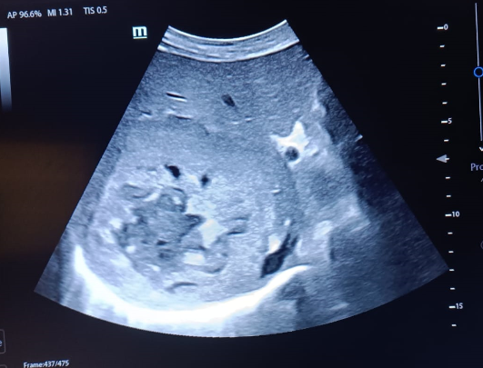 Murphy ecográfico positivo, lesión hepática única heterogénea de 4,5 x 7,5 cm aproximadamente.