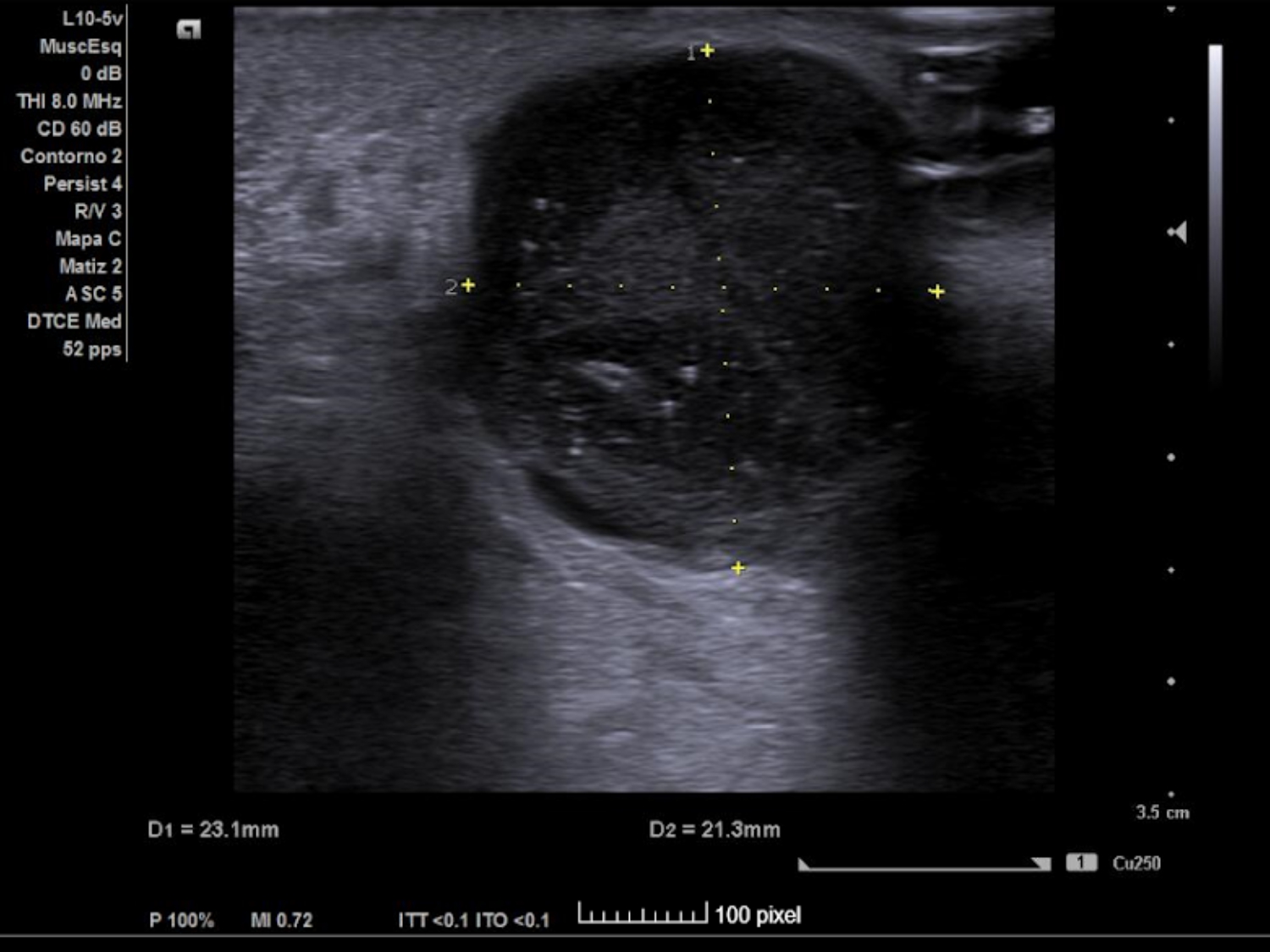 Se realiza ECO POCUS en la que se aprecia un absceso de 23 x 21 mm a menos de 1 cm de profundidad, con fácil acceso a nivel cutáneo y contenido heterogéneo, más anecoico en algunas zonas y poco tabicado.