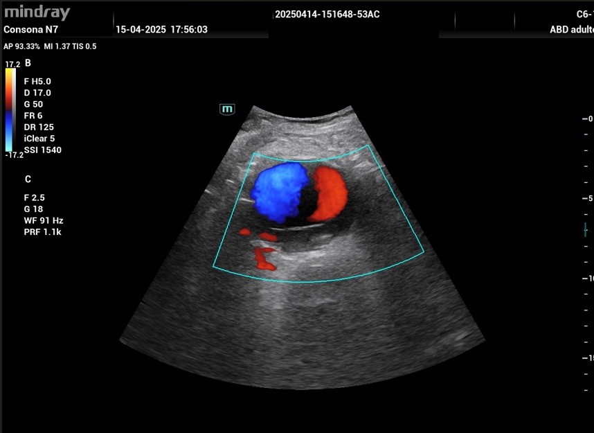 En el plano transversal se objetiva la dilatación de la aorta de hasta 5,91 cm de diámetro total, con presencia de trombo mural en pared posterior que deja una luz respetada de un diámetro de 4,19 cm (Imagen 2). Con Doppler Color se visualiza el signo del Yin -Yang, que representa un flujo anterógrado y retrógrado que puede aparecer en aneurismas y pseudoaneurismas. (Imagen 3).