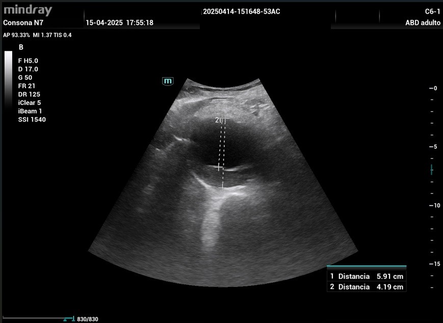 Ecografía en centro de salud: corte longitudinal paramedial izquierdo, se objetiva a nivel de epigastrio una dilatación lobulada de la arteria aorta abdominal (Imagen 1), que se inicia desde su porción suprarrenal y continua en todo su recorrido, afinándose al llegar a la bifurcación de arterias ilíacas.