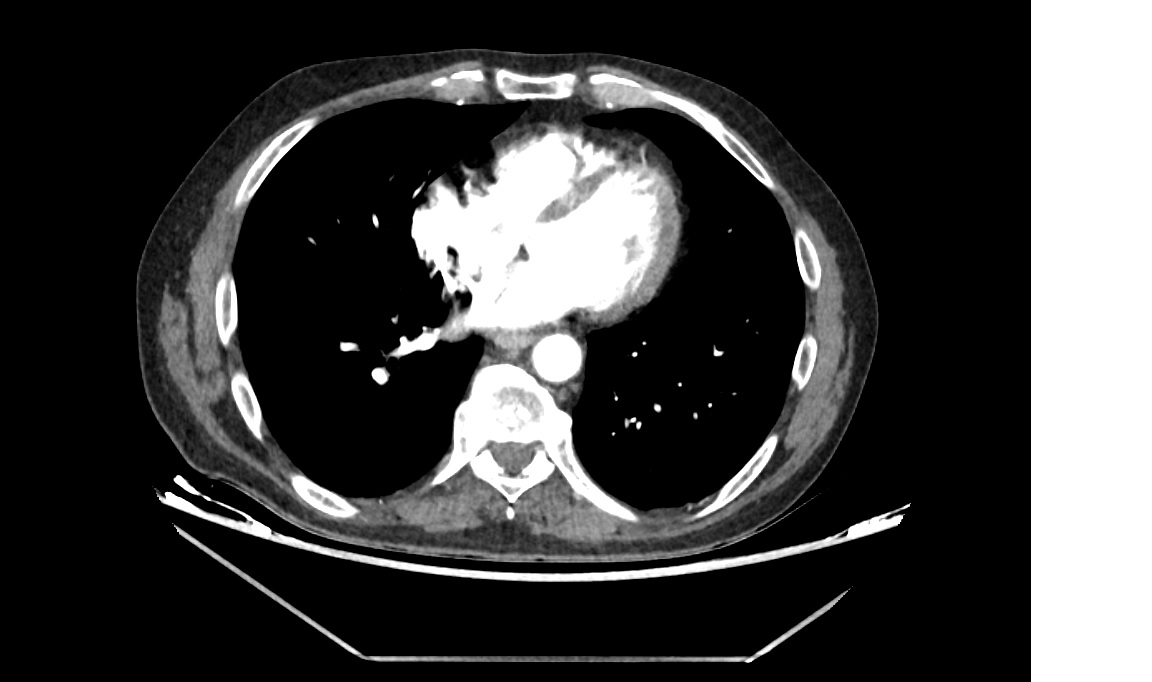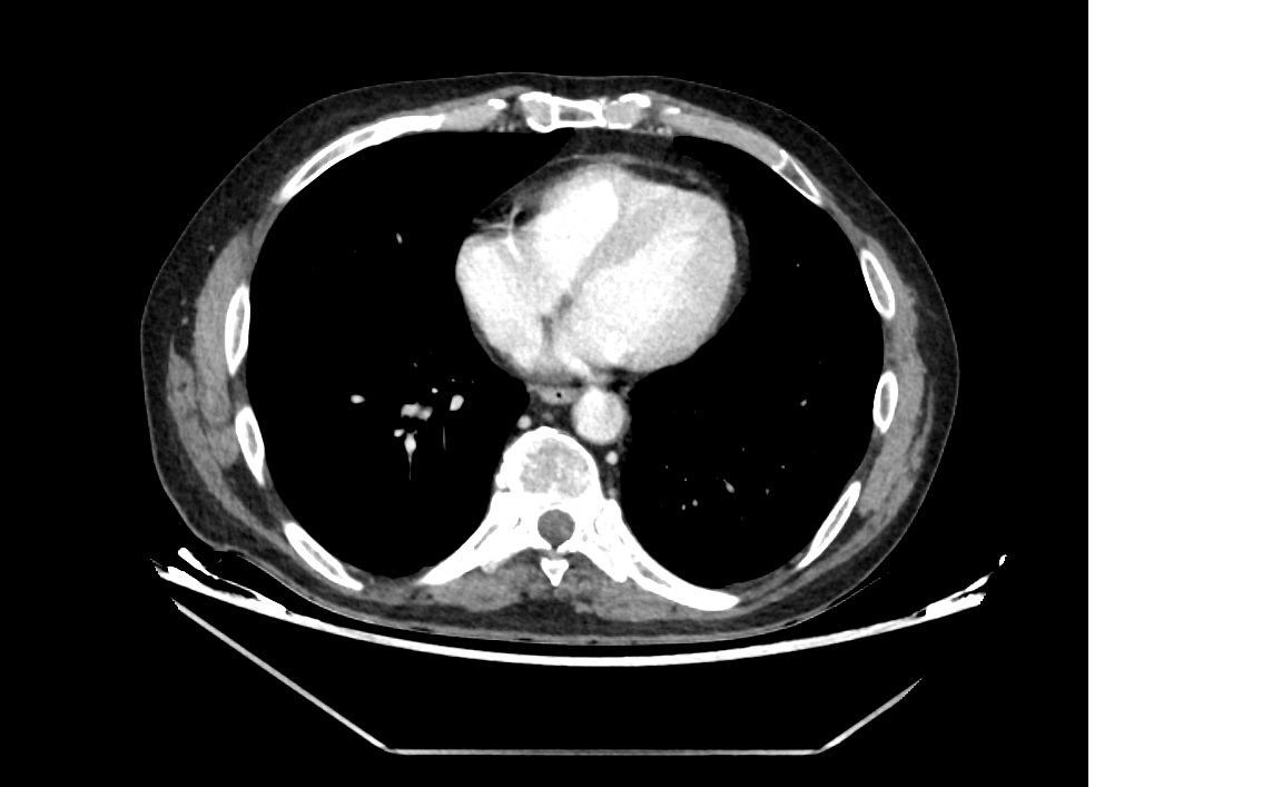 Antecedentes: Exfumador (50 paquetes/año) fibrilación auricular persistente, antecedente de tumor testicular tratado con cirugía y radioterapia. Exploración: Paciente consciente, estable hemodinámicamente, TA: 146/81 mmHg FC: 60, Sat: 97%. Abdomen blando, depresible, doloroso a la palpación en flanco izquierdo. Ecografía abdominal: Hallazgos inespecíficos, se decide enviar a servicio de Urgencias Hospitalarias para completar estudio.