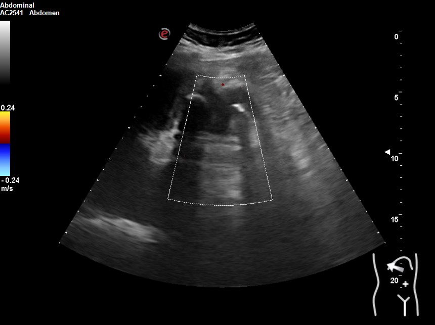 Vesícula biliar desestructurada, de paredes mal definidas con litiasis de 20 mm, que contacta con la pared de la segunda porción duodenal. Porta de tamaño normal. Vía biliar no dilatada.
