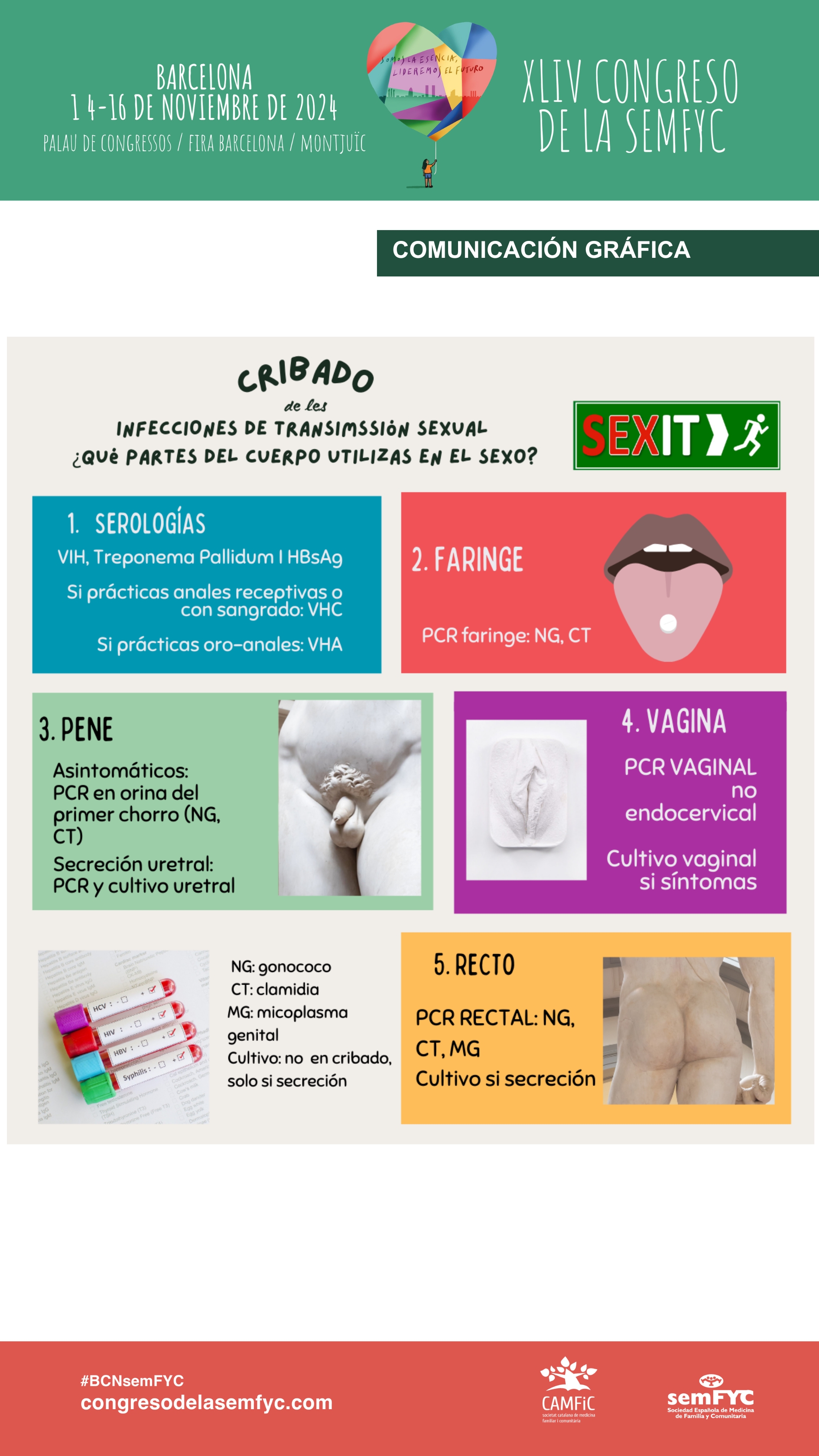 Se trata de una infografía que resume que pruebas debemos pedir a las personas sexualmente activas para el cribado de las ITS en función de la zona anatómica utilizada en sus prácticas sexuales. Optimizando coste-beneficio: realizando aquellas pruebas indicadas y que se realizan poco y, a su vez, reduciendo las que se piden cuando no están indicadas.