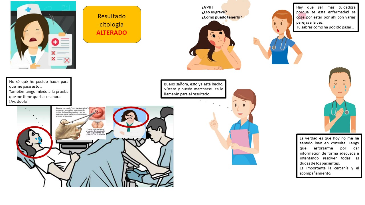 A lo largo de estas imágenes, podemos ver cómo tras recibir el resultado de una prueba complementaria (citología) alterada es derivada a ginecología para continuar estudio. En la consulta había un residente con la médico en su rotación por la misma unidad e intenta explicar cómo fue su visión de aquella consulta.