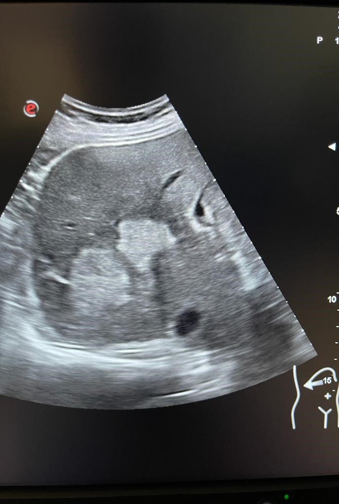 Se aprecia hígado heterogéneo con múltiples LOES hepáticas hiperecogénicas (una de ellas de unos 7x7 cm), sin captación de doppler. Al menos otras 2 LOES de menor tamaño presentan halo hipoecoico. Vesícula replecionada de contornos lisos y sin litiasis en su interior. Ambos riñones visualizados de tamaño normal y sin datos de hidronefrosis.