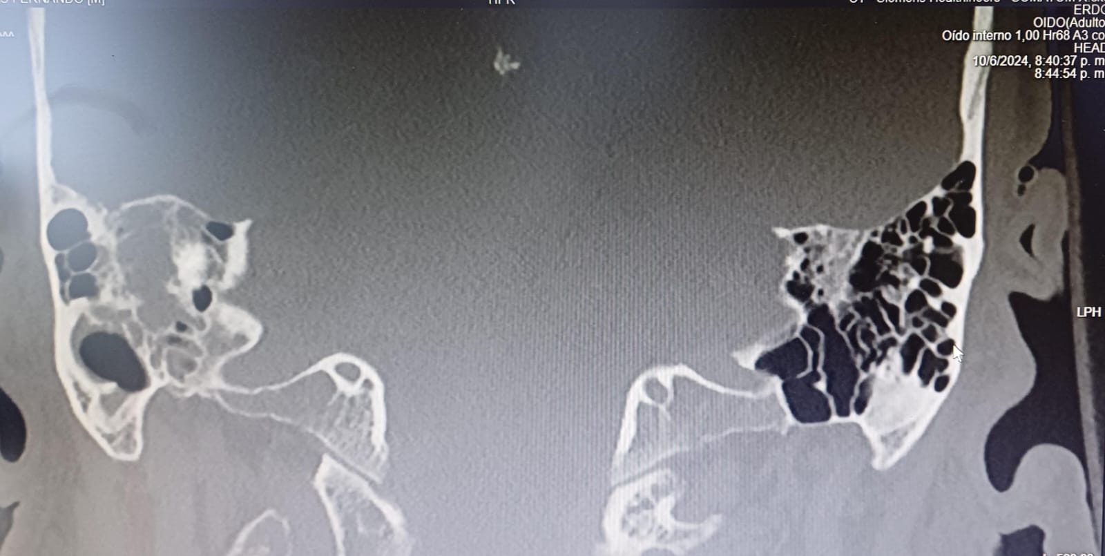 Manejo conservador conjunto Otorrinolaringología (ORL)y Neurología (NRL). Ante situación clínica se traslada a Unidad de Críticos y posteriormente ingreso en UMI para neurovigilancia con buena evolución. Seguimiento con TC y RNM cráneo y oído presentando ocupación de oído medio y celdillas mastoideas derechas, solución de continuidad en techo de mastoides con gas intracraneal. Empiema subdural en convexidad derecha 6 mm (previo 3 mm). Ante febrícula y leucocitosis mantenida se realiza nueva PL, con incremento de glucorraquia y sin gérmenes, se amplía antibioterapia a meropenem con buena evolución clínica posterior. Alta a planta de NRL con seguimiento por Unidad de Enfermedades Infecciosas.