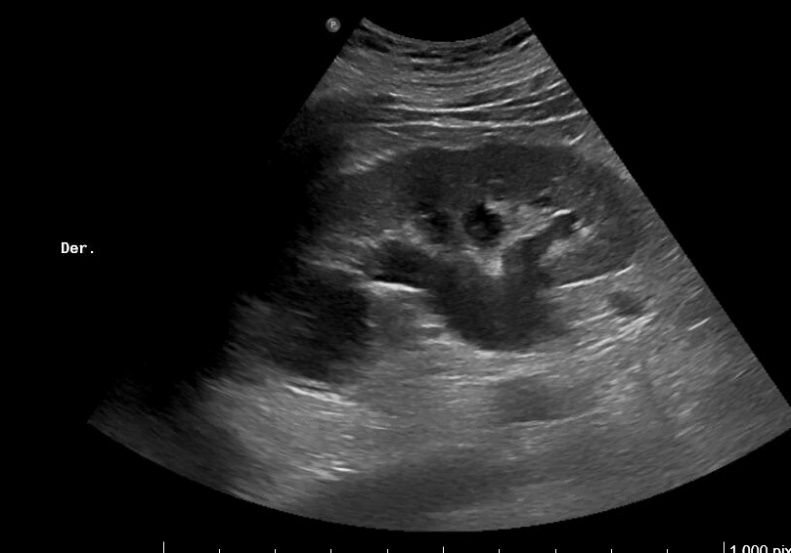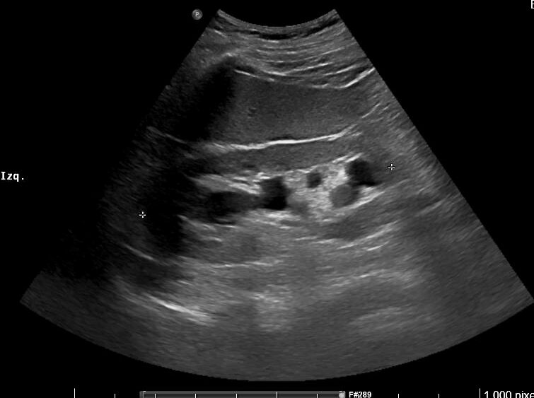 Imagen 1. Riñón derecho: hidronefrosis grado II. Tamaño 11.2 cm.
