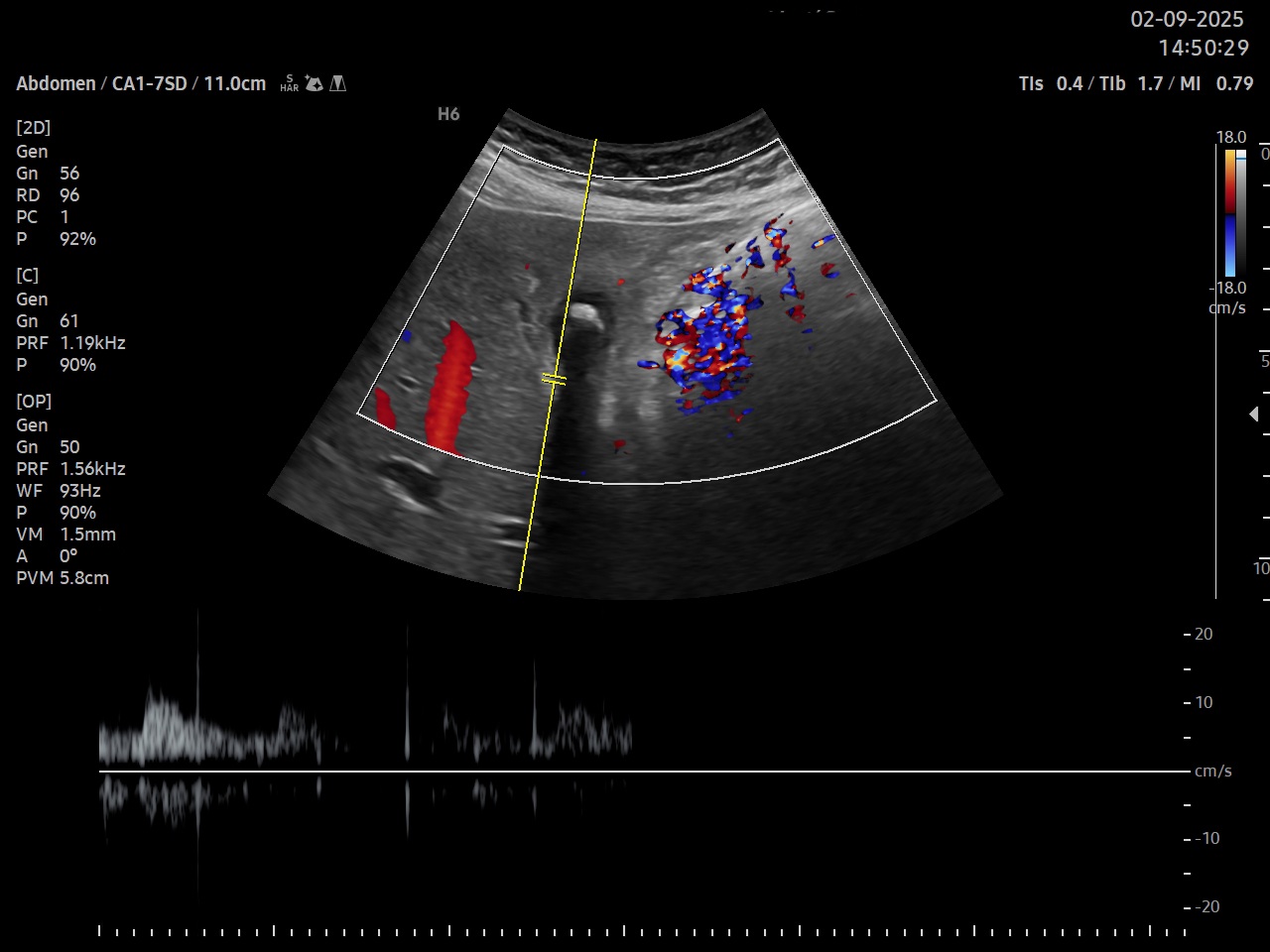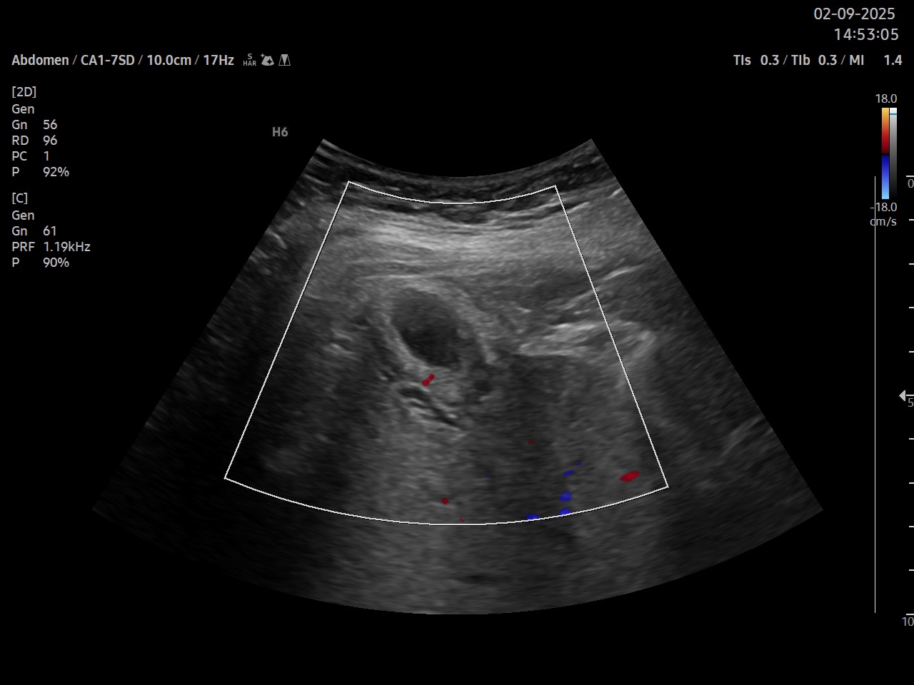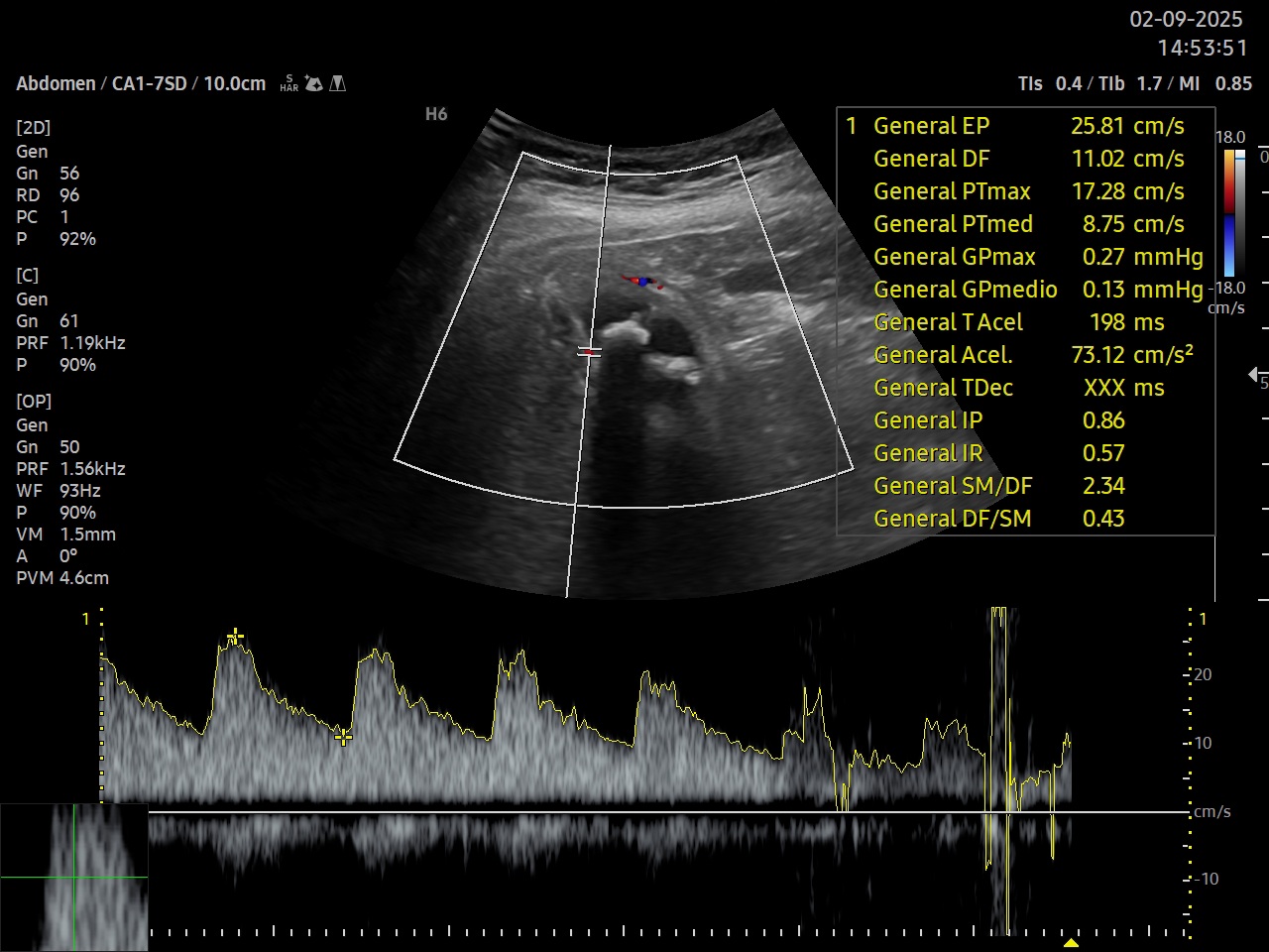 Ecografía clínica: parénquima hepático homogéneo de bordes lisos, signo de Murphy ecográfico positivo, vesícula biliar distendida a pesar de no ayuno con tres imágenes hiperecogénicas con centelleo y sombra posterior, pared engrosada hiperecogénica, se detecta líquido perivesicular. Doppler pulsado a nivel de arteria cística. Páncreas visible en parte sin alteraciones en su interior, no se visualiza Wirsung ni dilatación a nivel de ampolla de Vater, bazo y riñones de tamaño y ecoestructura normal, mioma uterino, vejiga parcialmente replecionada, aorta de calibre normal.