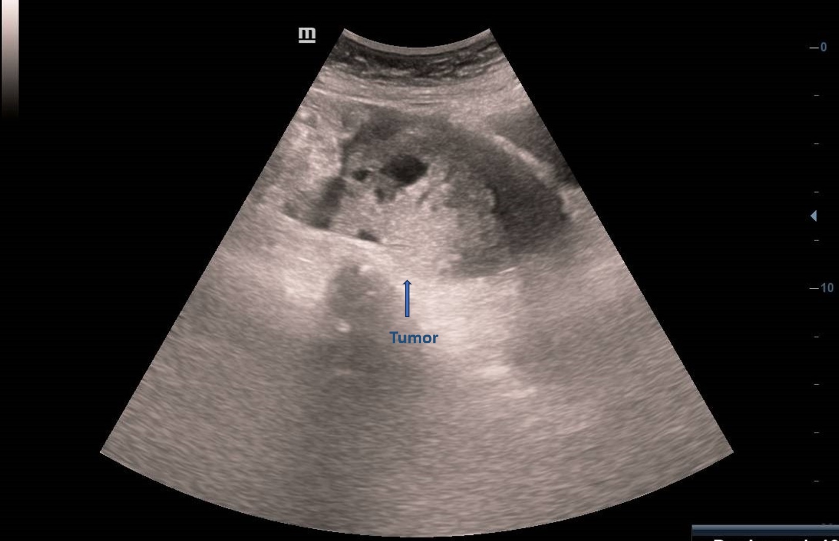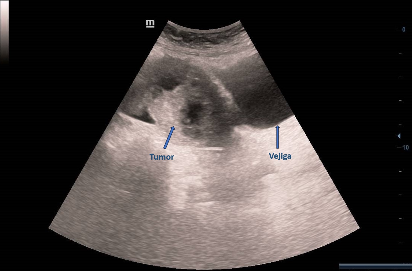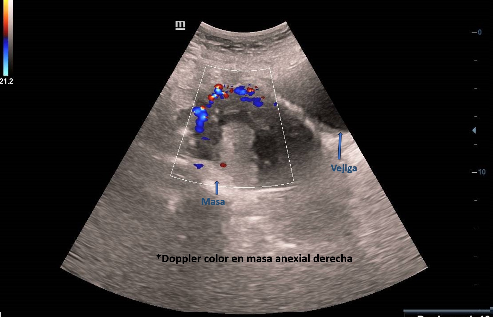 Ecografía abdominal en Atención Primaria: masa derecha adyacente a vejiga, vascularizada, de ecogenicidad heterogénea de unos 6 cm sin quedar clara dependencia del ovario derecho con imagen hipoecogénica en pelvis sugerente de ascitis. Se deriva paciente a ginecología preferente donde se realiza ecografía transvaginal: Tumoración anexial derecha, contorno irregular sugerente de neoplasia.