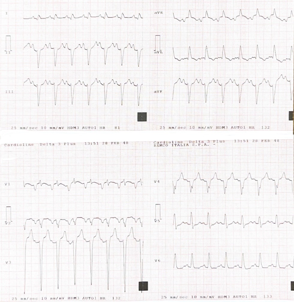 ECG taquicardia sinusual, Onda P Pulmonar, elevación ST en cara inferior y V2 a V4.