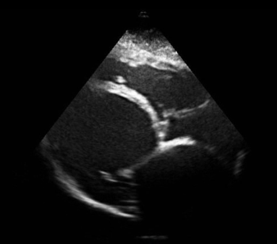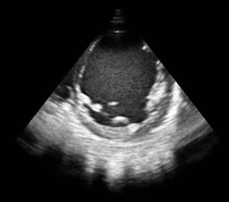 Eje corto y eje largo ecocardoscopia con dilatación severa ventrículo izquierdo, anillo mitral y aurícula izquierda, acinesia global ventrículo izquierdo, ausencia derrame pericárdico.