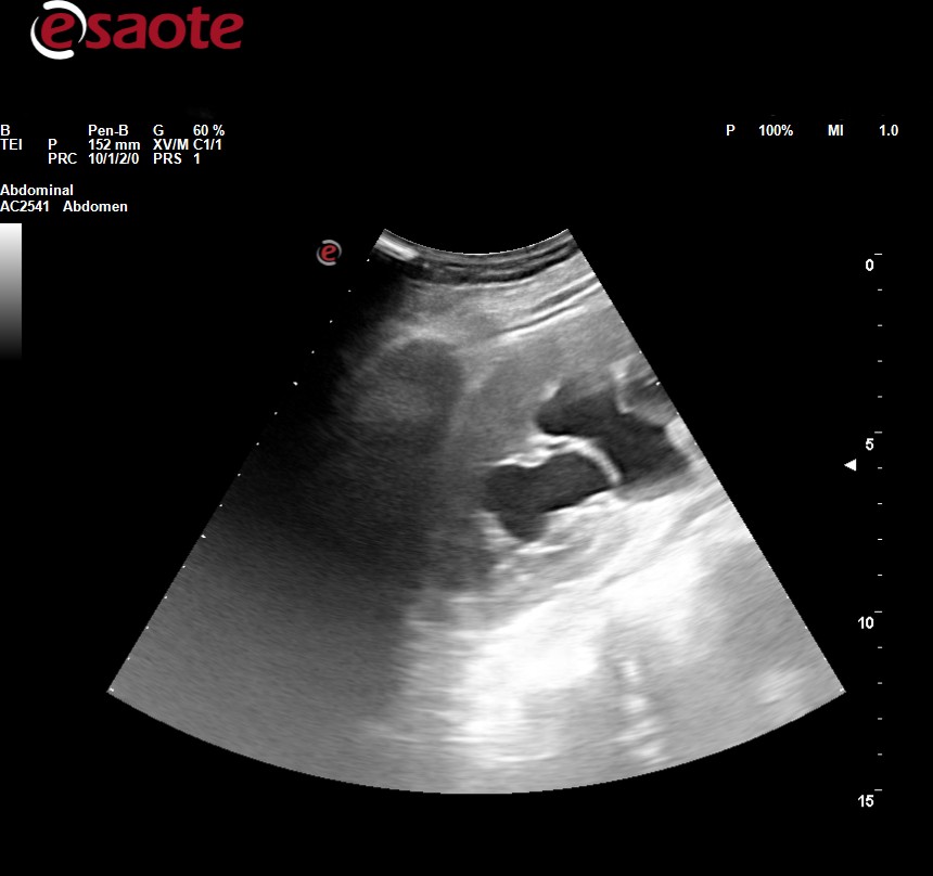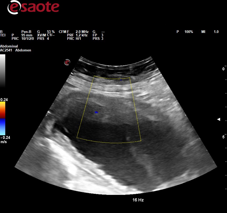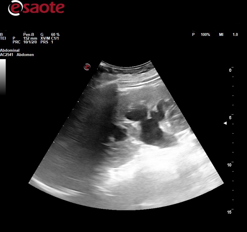 Ecografía clínica abdominal: observamos dilatación ureteropielocalicial bilateral junto con pared engrosada de la vejiga.