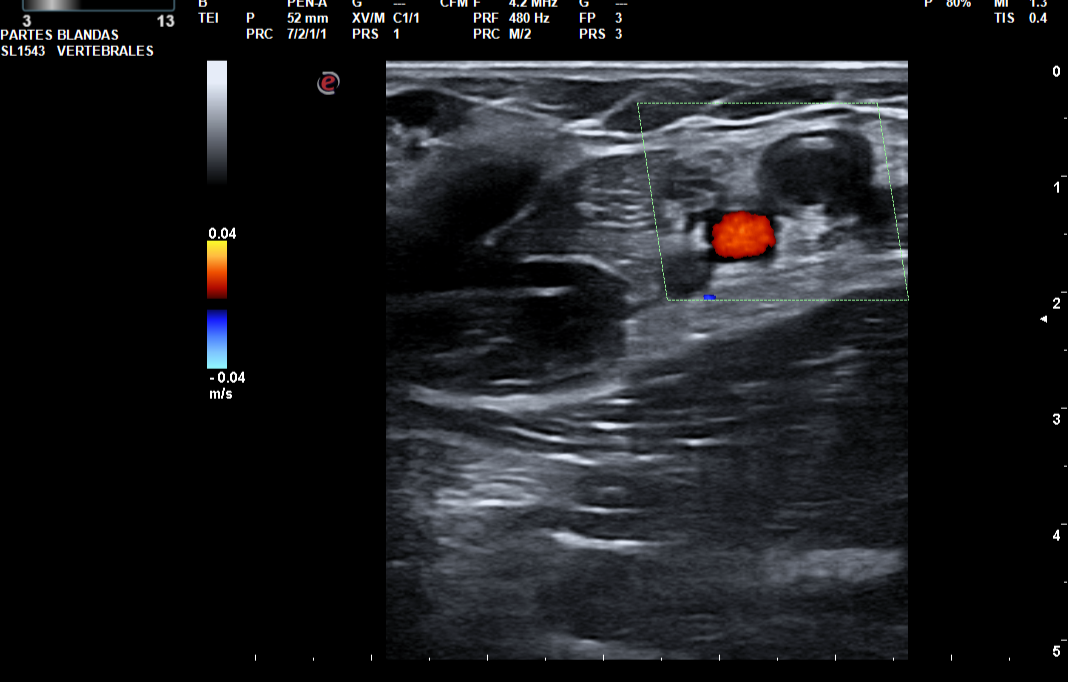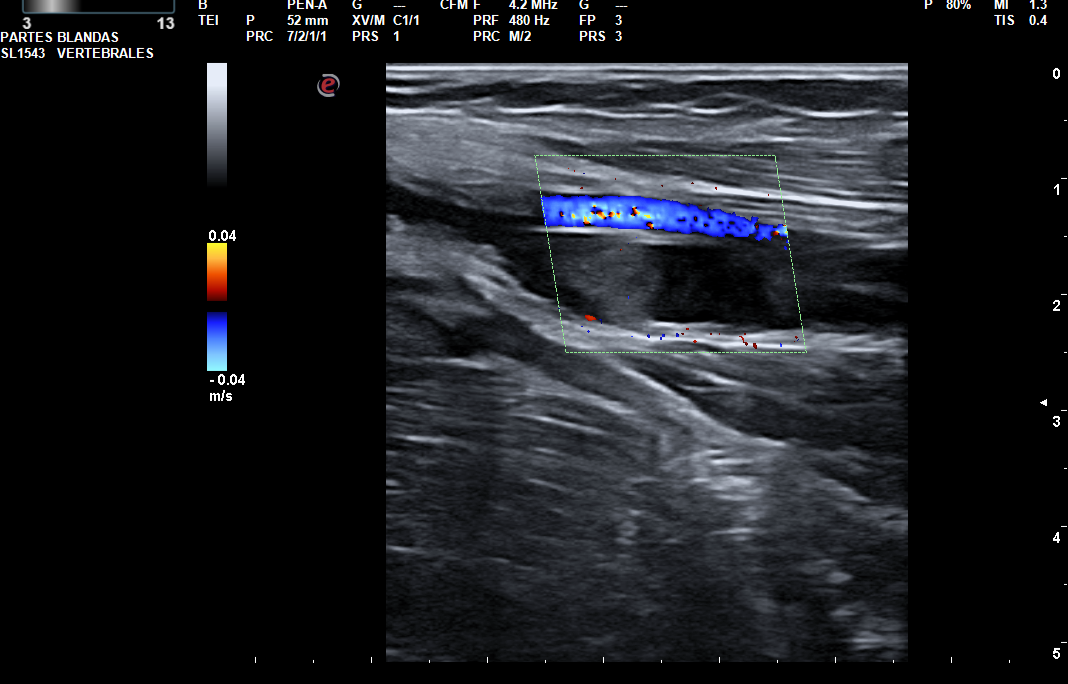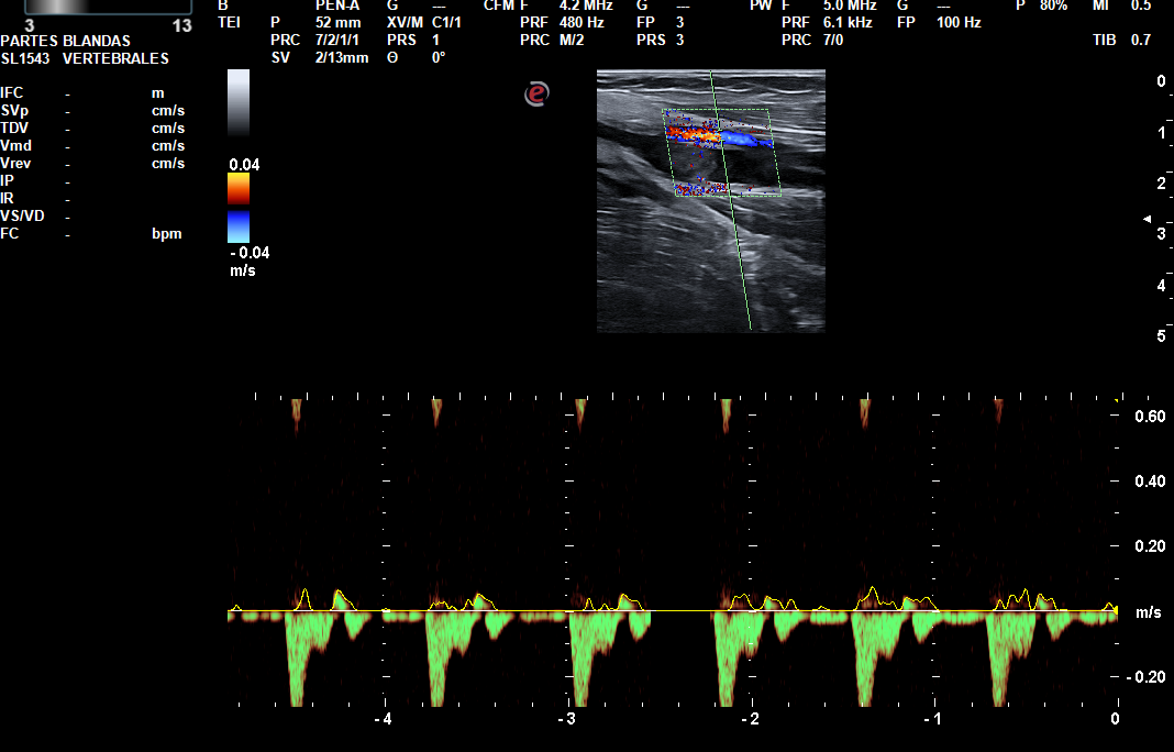Trombo flotante en la confluencia yugulosubclavia. Ocupación por material hipoecogénico sugerente de trombosis venosa aguda, de la vena subclavia y ramas tributarias regionales, vena axilar, confluencia entre la vena cefálica (trombosada solo en su segmento más proximal a la confluencia) y axilar, así como de las venas braquiales hasta el codo.