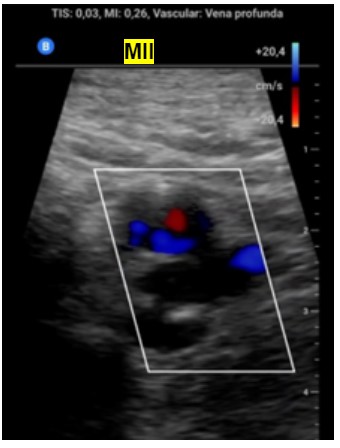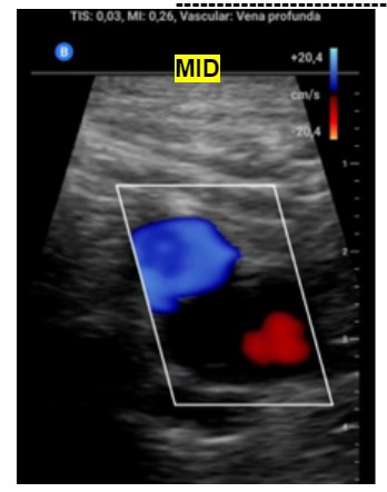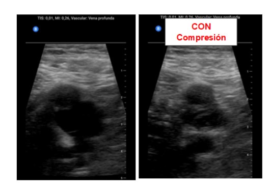 Ante la sospecha de Trombosis venosa profunda realizamos ecografía de compresión venosa de miembros inferiores detectando la falta de colapsabilidad de la femoral común y femoral superficial del miembro inferior derecho, cosa que no pasaba en el izquierdo.