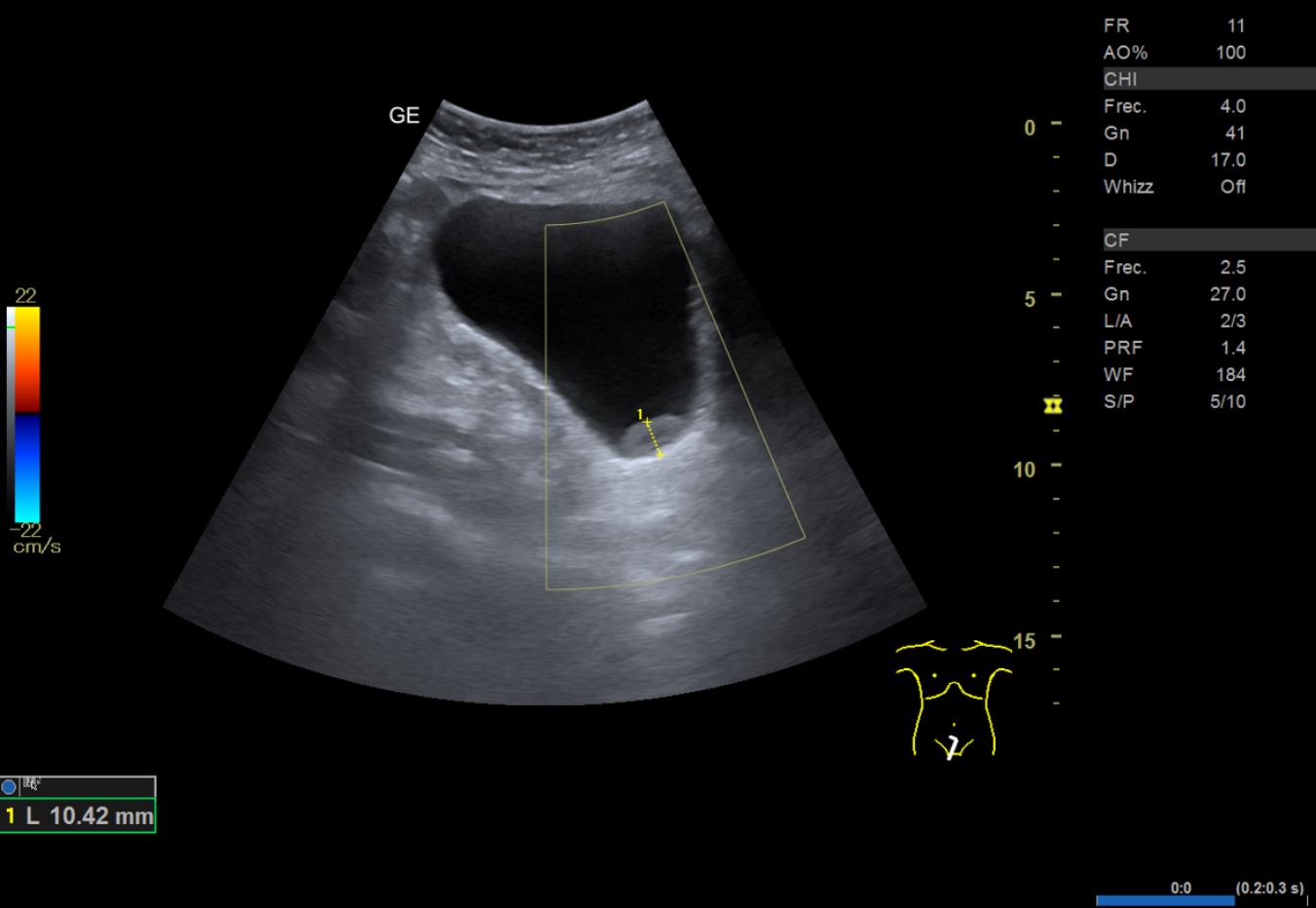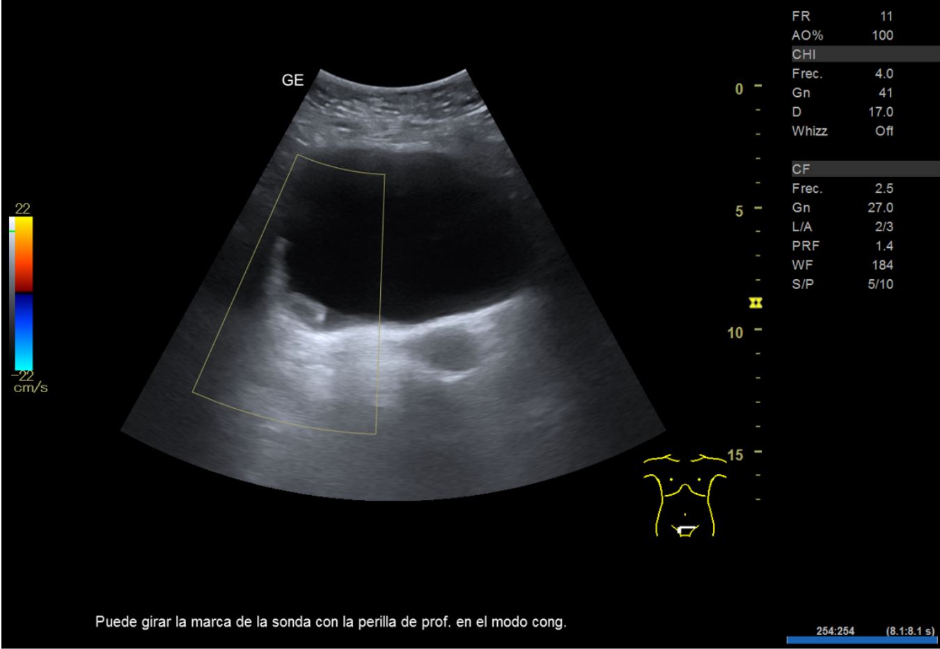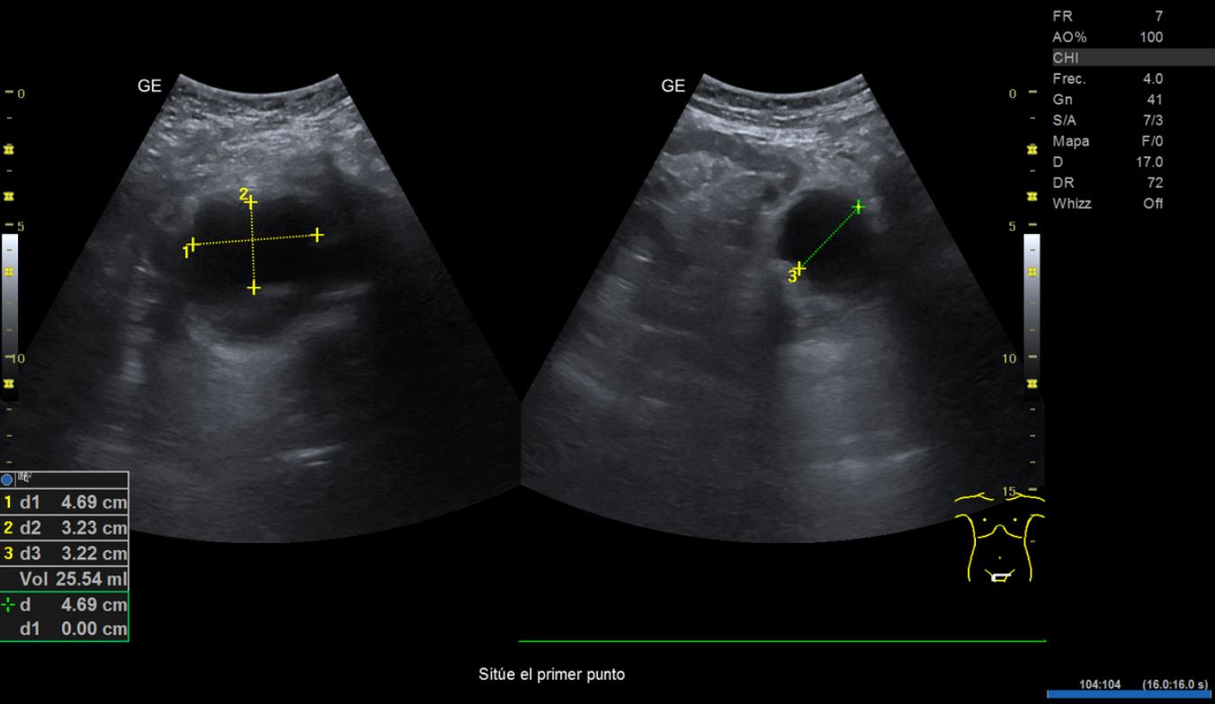 En primer lugar se derivó a ginecología por sospecha de sangrado de origen ginecológico donde visualizan ecográficamente un grosor endometrial de 5-6 mm y realizan una biopsia endometrial con resultado de escasos fragmentos superficiales de endometrio atrófico. Tras descartar origen ginecológico y ante la persistencia del sangrado, se orienta como hematuria monosintomática y se realiza una ecografía en el centro de Atención Primaria donde se visualiza imagen hipoecogénica dependiente de la pared vesical.