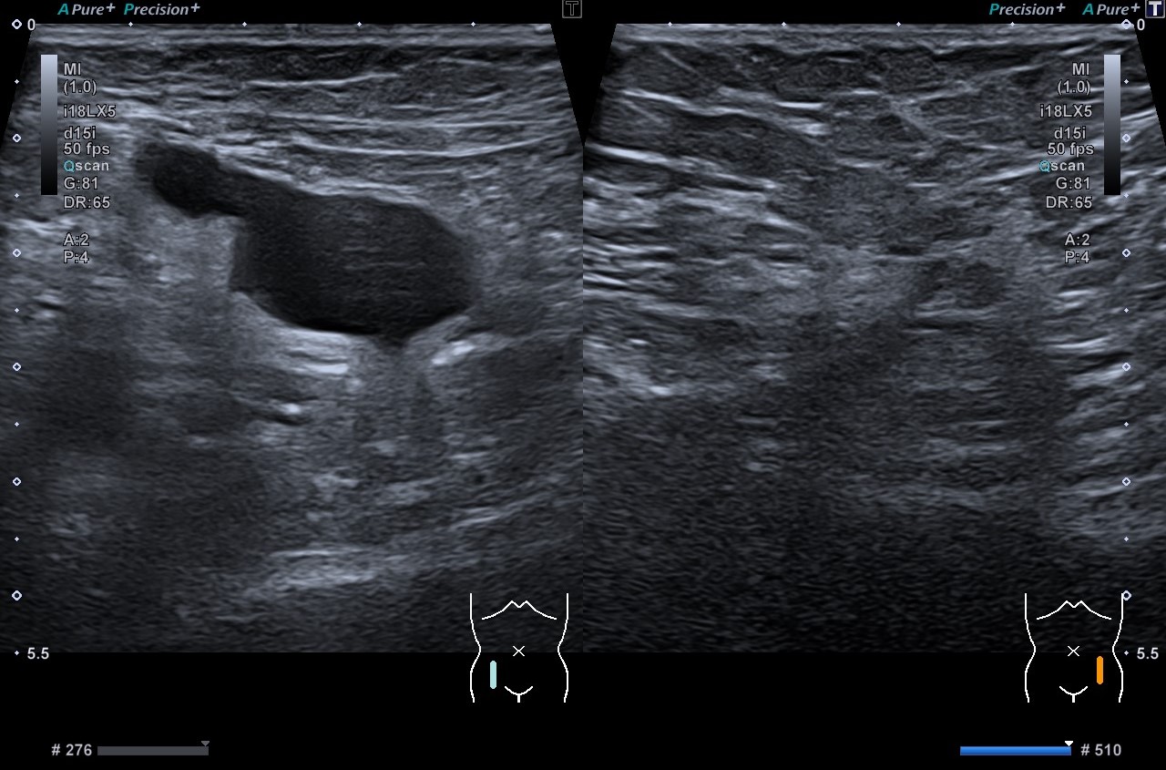 A los 7 meses de la intervención, la paciente consulta por aparición de un bulto sobre región intervenida. Apreciamos nuevamente la misma imagen y derivamos a cirugía general para nueva valoración, bien sea por hernioplastia fallida como para plantearse nuevos diagnósticos diferenciales como el quiste de Nuck, sugerido previamente por el radiólogo. La paciente está actualmente pendiente de valoración.