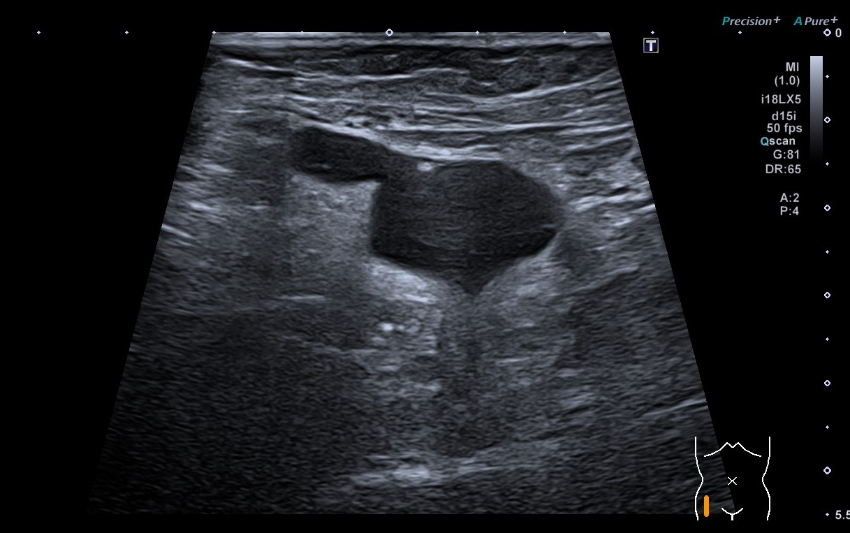 Se aprecia una colección líquida de unos 30 milímetros (mm) alargada con el extremo distal que termina en forma de pico en región inguinal derecha. Ecográficamente se aprecia ligera modificación con Valsalva.