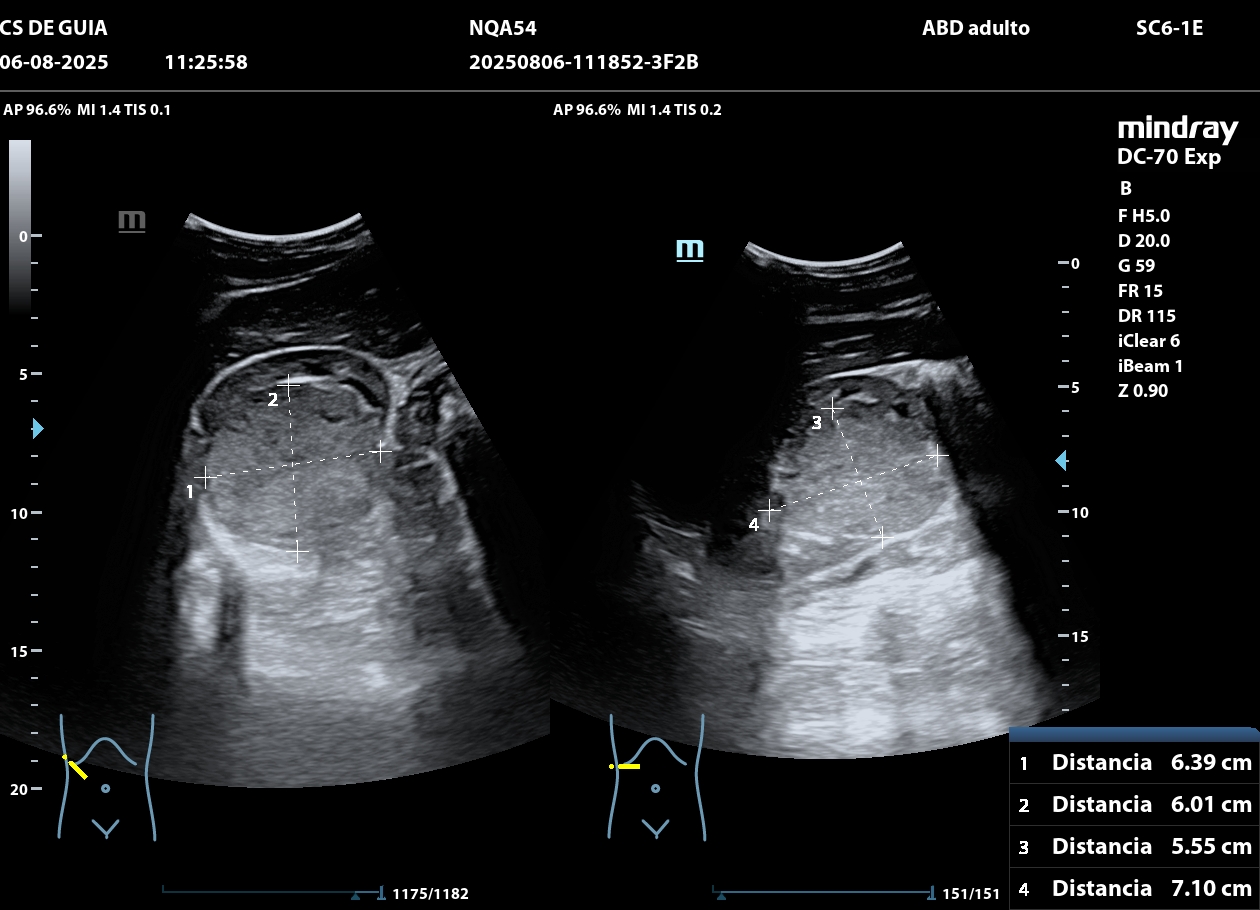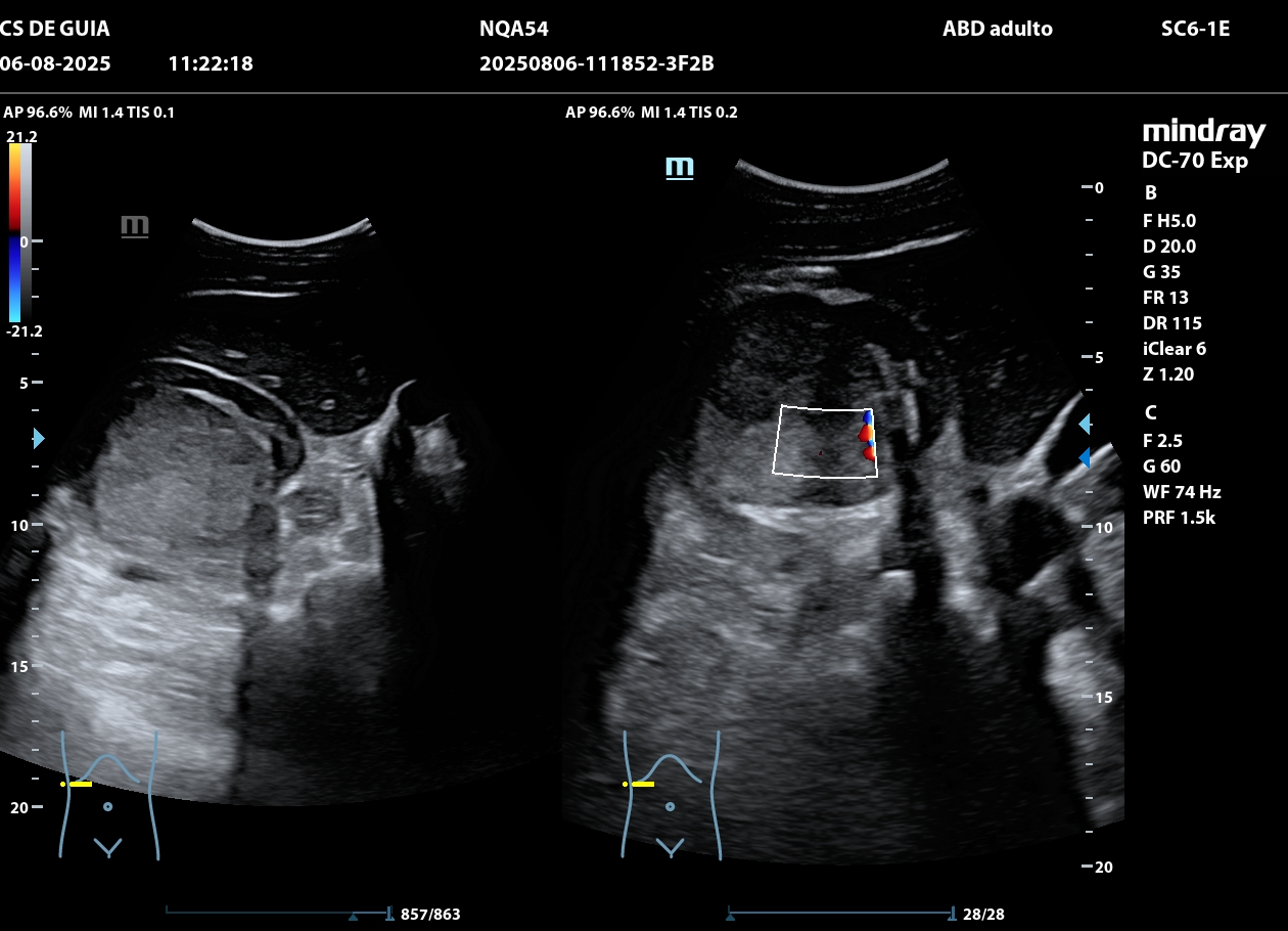 Ecografía: riñón derecho una masa isoecogénica de 7,1 x 6,3 cm de diámetro en médula renal que no deforma la cortical, vascularización periférica y sin sombra posterior.