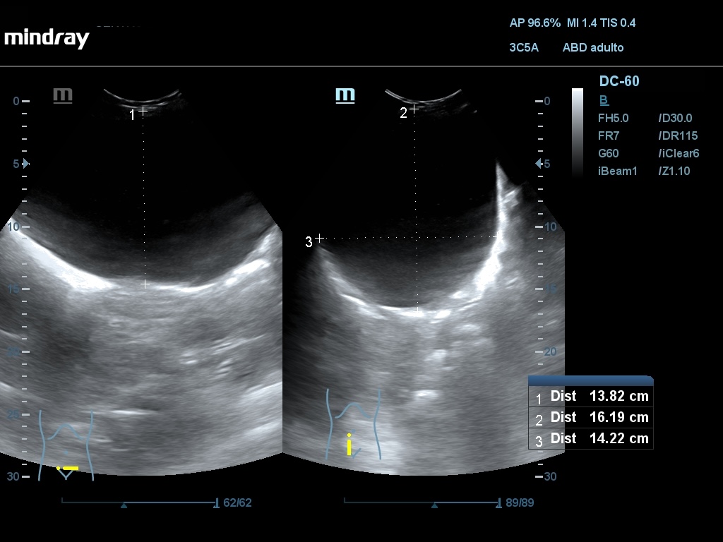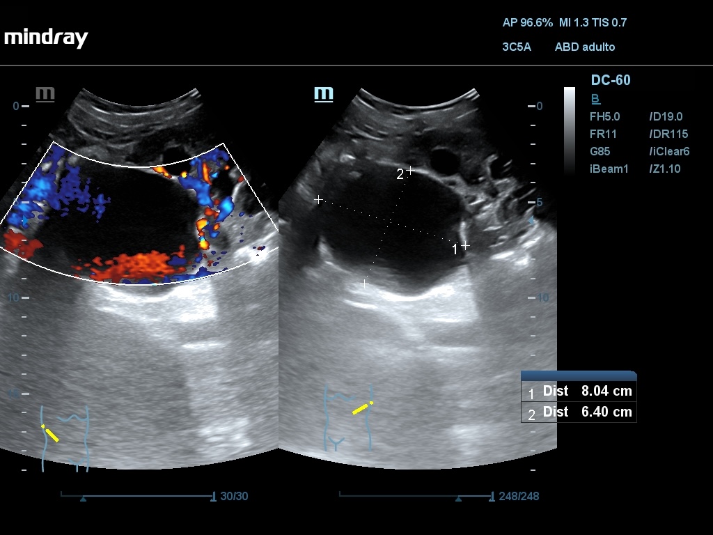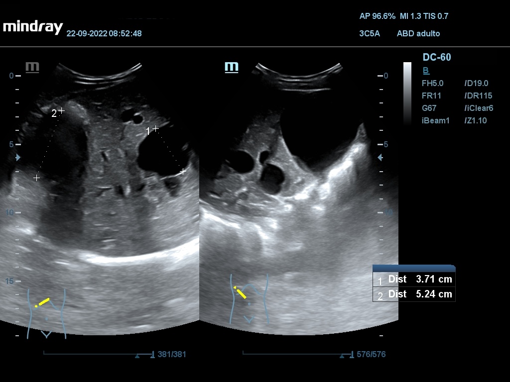 Ecografía abdominal: Se observan varios quistes simples a nivel hepático, siendo el mayor de 52,4 mm, en ambos riñones siendo el mayor de 77 x 83 mm en RD y de 80 x 64 mm en RI. En hipogastrio se observa imagen redondeada, anecogénica, con sombra posterior, de borde liso y fino, no tabicada, de aprox. 161 x 142 mm y otra de características similares de 74 x 54 mm.
