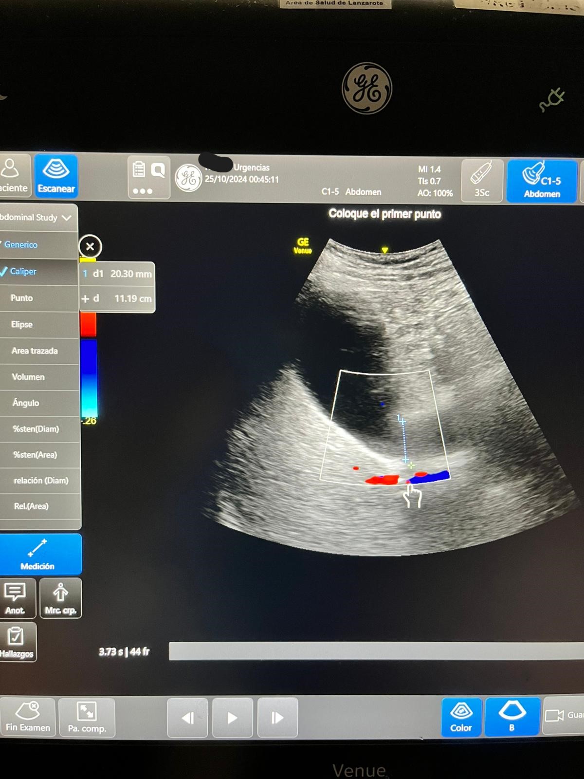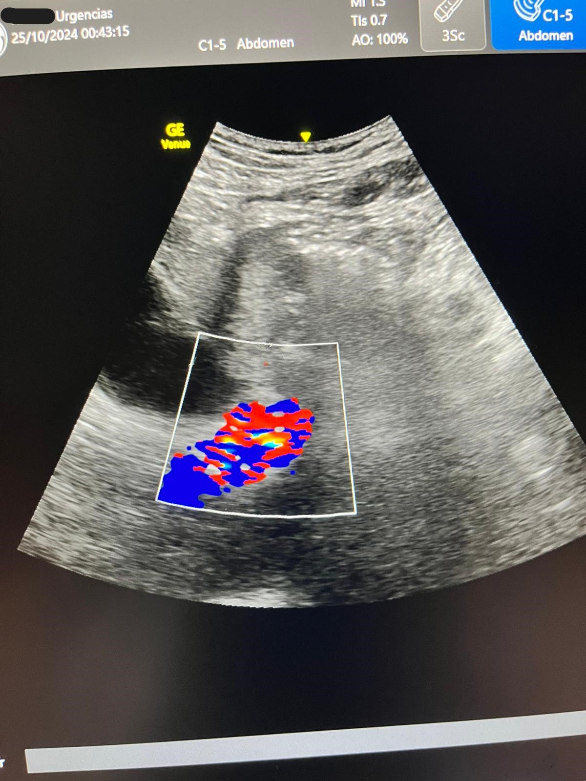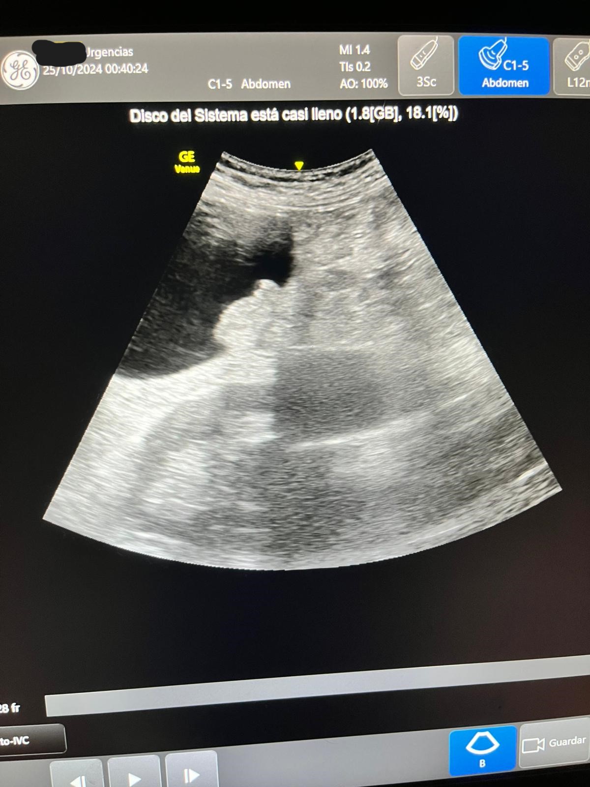 Abdomen blando, depresible, doloroso a la palpación en epigastrio. No datos de irritación peritoneal. PPRB negativa. AS: Hb: 12,9, plaquetas: 178, leucos: 14,5, glucosa: 172, tropos: 61, control 62, bilrrubina: 2,38, directa 1,8, PCR: 0,3, AST: 354, ALT: 249.