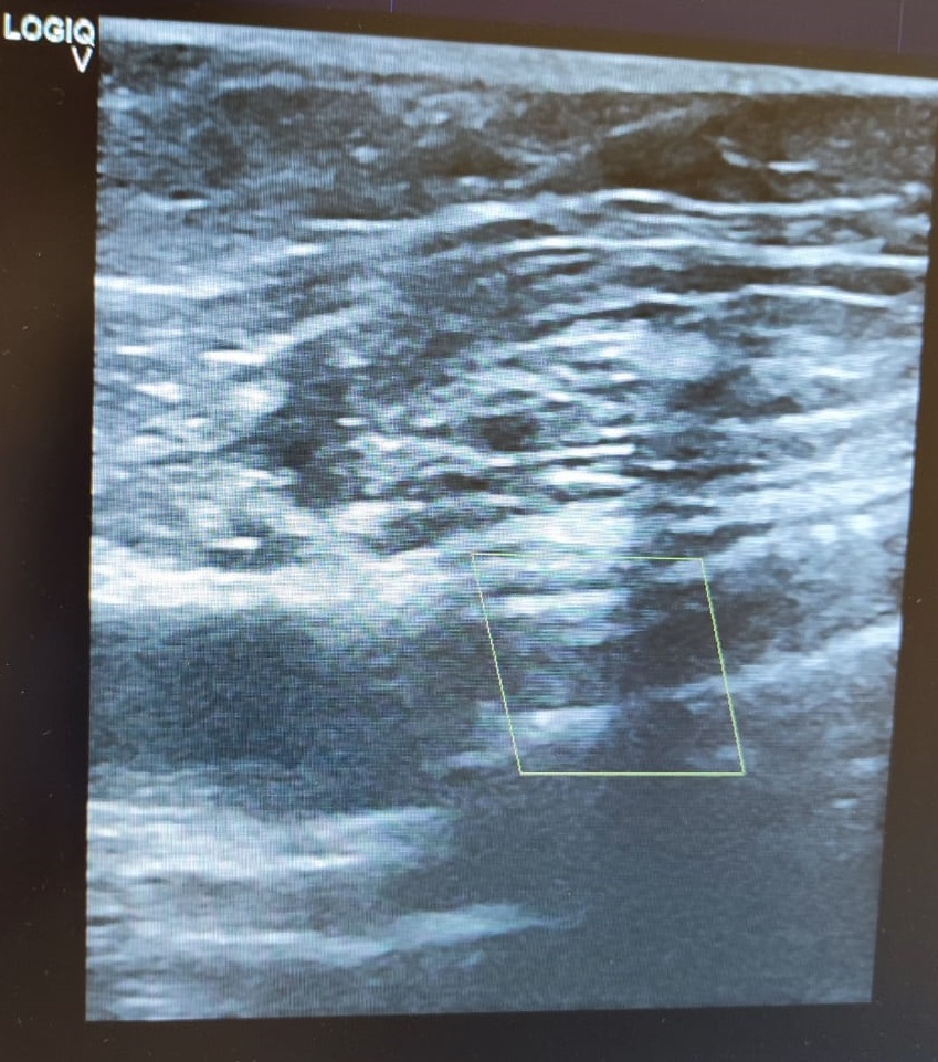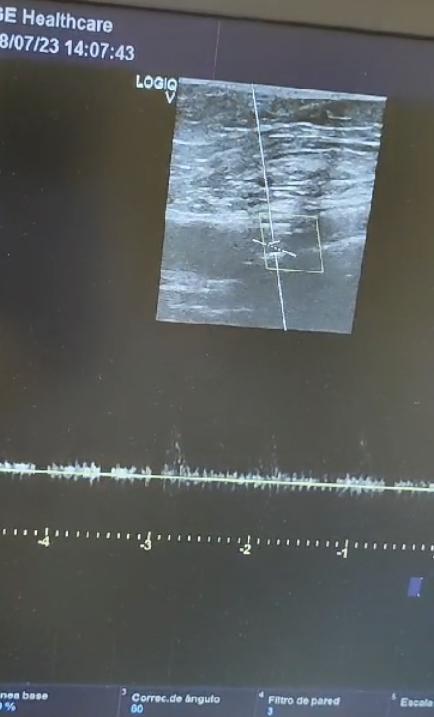 El paciente relata dolor gemelar y aumento de claudicación intermitente. Se realiza ecografía a pie de cama donde se observa trombosis del stent de toda la femoral superficial.