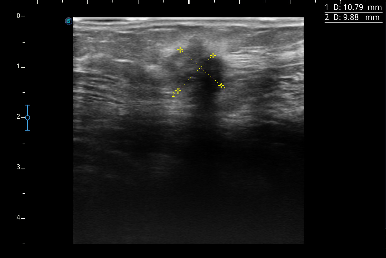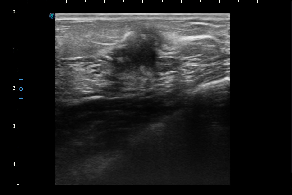 No antecedentes de interés. No traumatismo previo ni sobrecarga muscular importante. En la EF se palpa un nódulo de unos 2 cm aprox. de diámetro, molesto pero indoloro al tacto, algo duro y dudosamente adherido a planos profundos, en el CSE de la mama derecha. No bultos en axilas ni en la mama contralateral. Se realiza ecografía de mama.