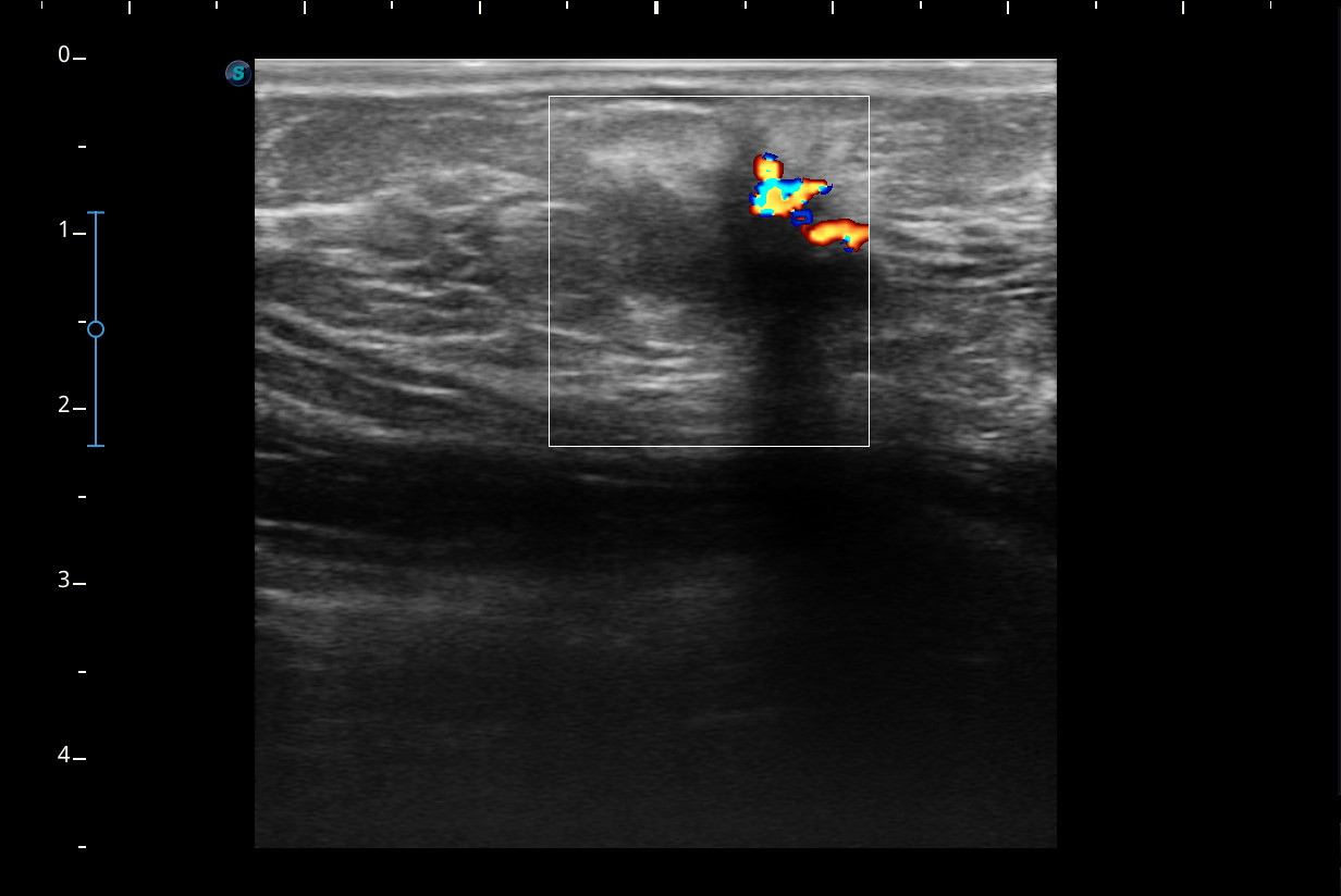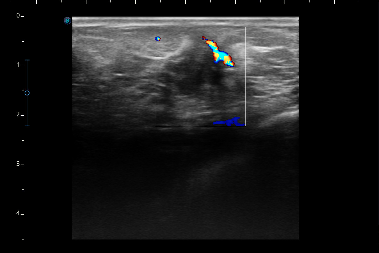 Se visualiza un nódulo mal delimitado, de bordes irregulares y algo espiculados, con captación doppler color sobre todo en periferia y posibles focos centrales de necrosis, compatible con posible neoplasia.