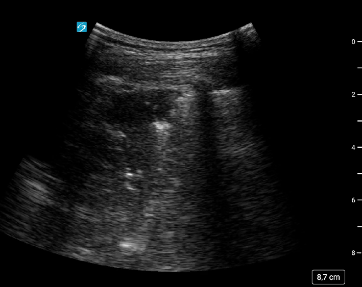 Realizamos una ecografía clínica en la que vemos líneas A en todos los campos pulmonares izquierdos. Sin embargo, en los derechos, observamos abundantes líneas B, especialmente en campos medios y una imagen de consolidación del parénquima pulmonar.