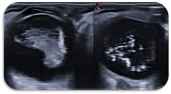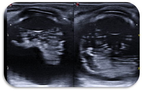 Primer caso: imagen hiperecoica avascular sin sombra posterior que ocupa todo el polo posterior, que se mueve con los movimientos oculares. La retina plegada. Ante sospecha de tumor se hace ecografía en ojo contralateral y se obtienen las mismas imágenes.