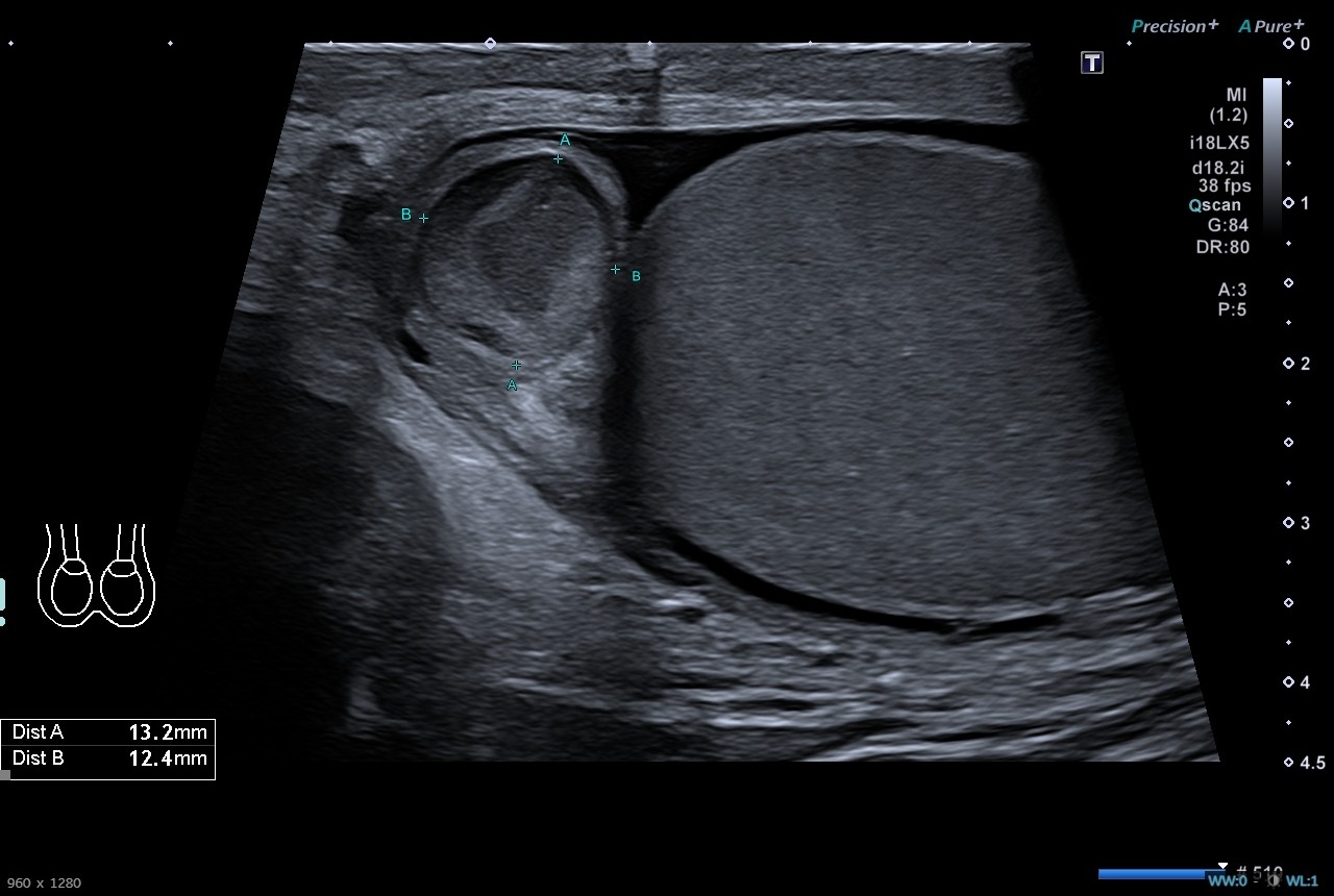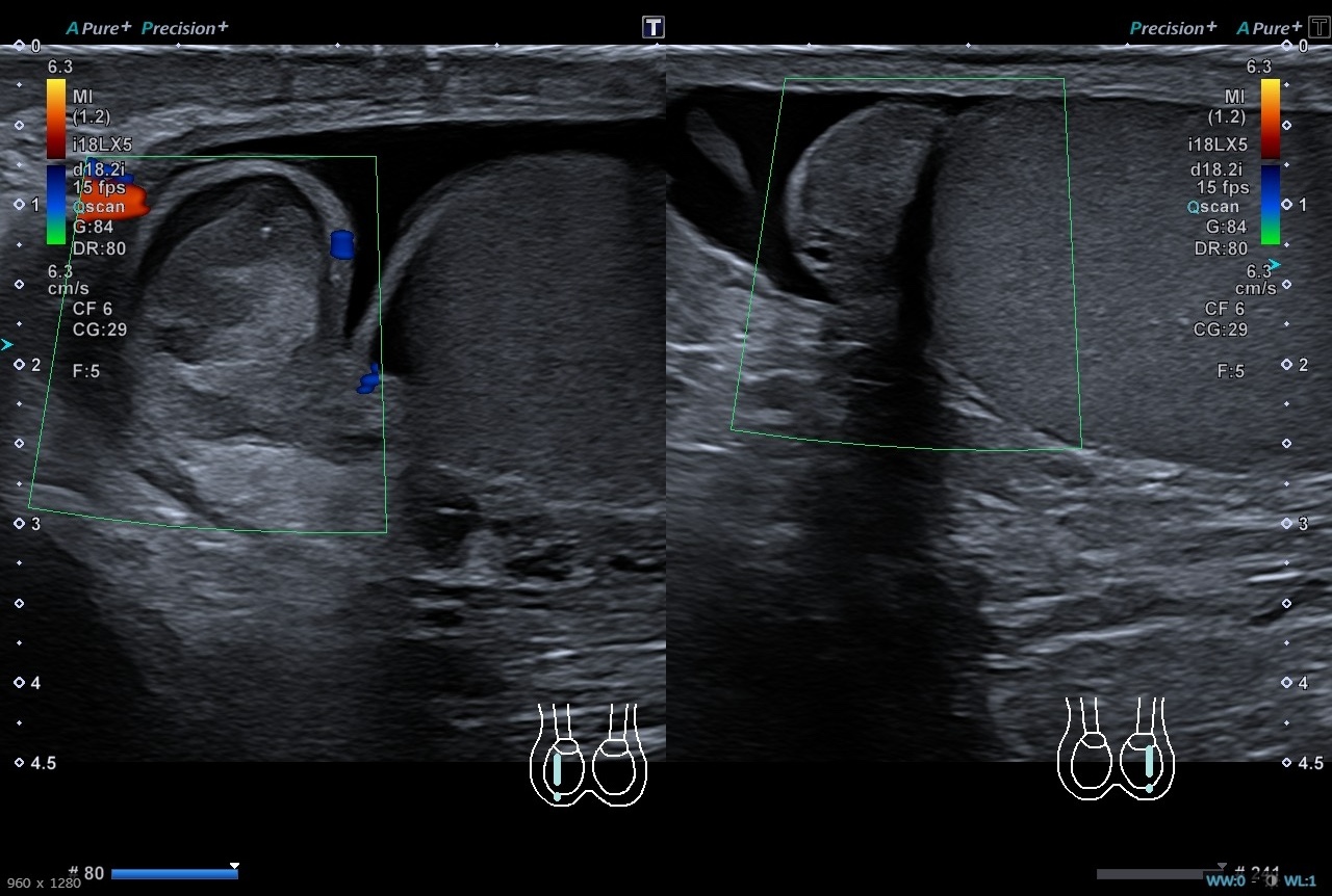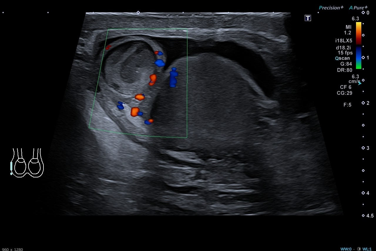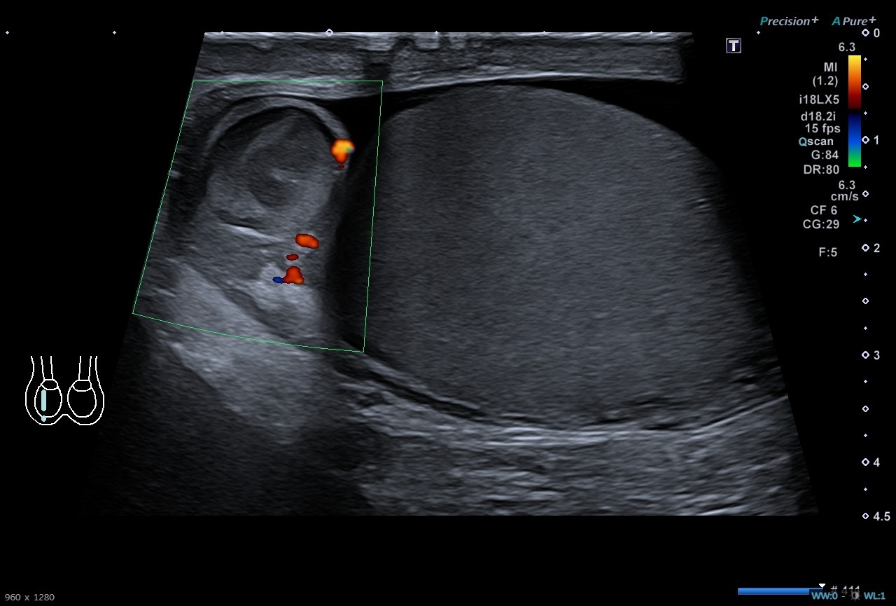 Pruebas complementarias: Sistemático de orina negativo. Ecografía escrotal: Testículos, epidídimos y cordones espermáticos de tamaño, morfología y ecogenicidad normales. Doppler normal en ambos testículos. Adyacente al polo superior del testículo derecho se identifica una estructura redondeada de unos 13 x 12 mms de ecogenicidad heterogénea, sin captación Doppler interna. Es sugestivo de torsión de hidátide de Morgagni, a correlacionar con evolución clínica. No hay datos de torsión testicular. Presencia de moderado hidrocele de aspecto reactivo.