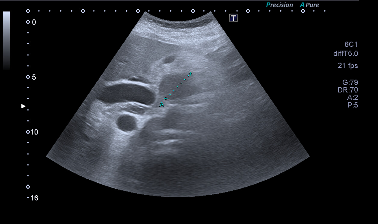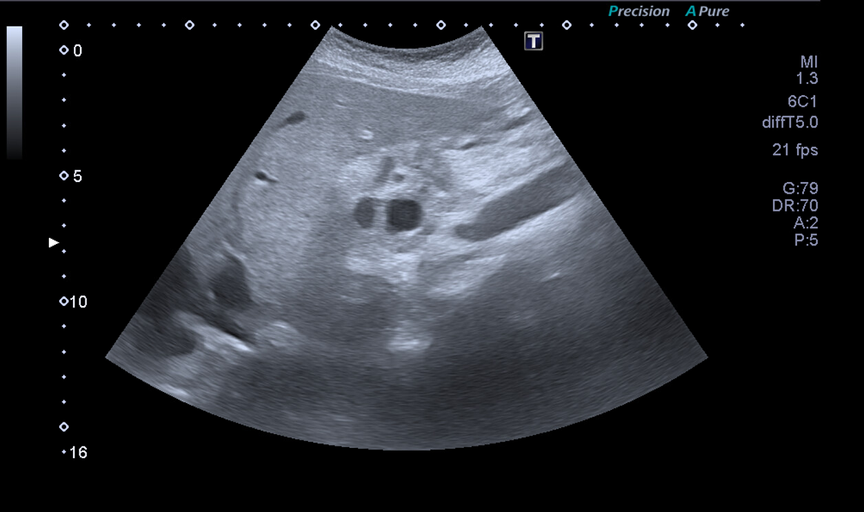 Ante la situación de dolor abdominal hacemos ecografía a pie de cama: se evidencia imagen redondeada de contenido heterogéneo de aproximadamente 38 mm, con dos imágenes redondas anecoicas en su interior en cabeza de páncreas. Restos de la exploración ecográfica sin alteraciones.