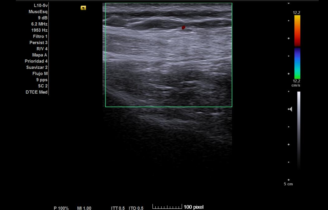 Analgesia, relajantes musculares y fisioterapia. Ante la no mejoría, infiltración ecoguiada del nervio supraescapular (1 ml trigon + 4 cc anestésico local). Sin incidencias.