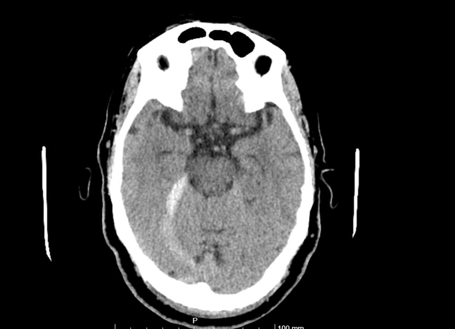 Pruebas de laboratorio normales. ECG con fibrilación auricular a 120 lpm. TAC craneal simple: Hemorragia subaracnoidea en tentorio derecho y hoz cerebral posterior junto con encefalopatía de pequeño vaso crónica severa (Fazekas 3).
