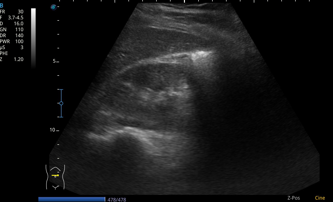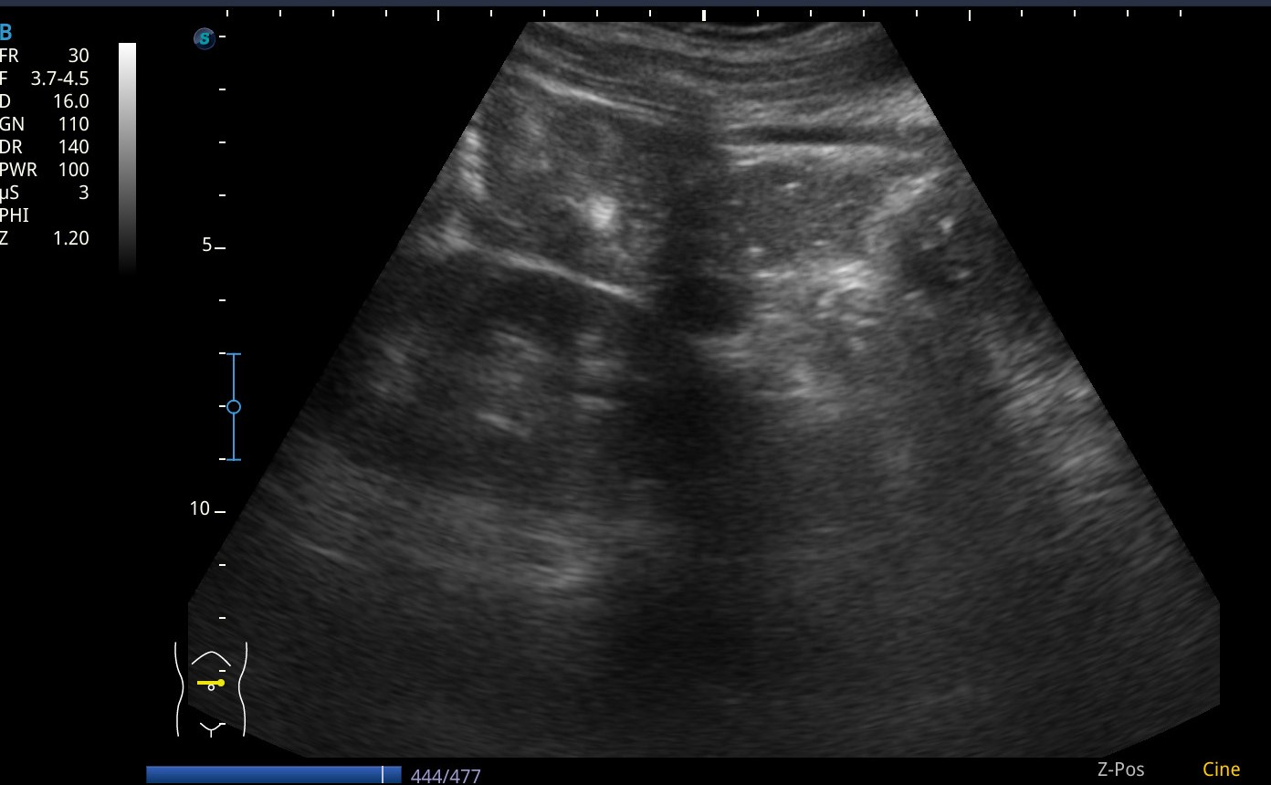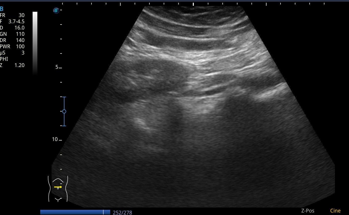 Se realiza ecografia a pie de cama que muestra como en el flanco derecho presenta silueta renal con un polo superior visible, sin poder definir el polo inferior, y la misma imagen en la silueta renal izquierda.