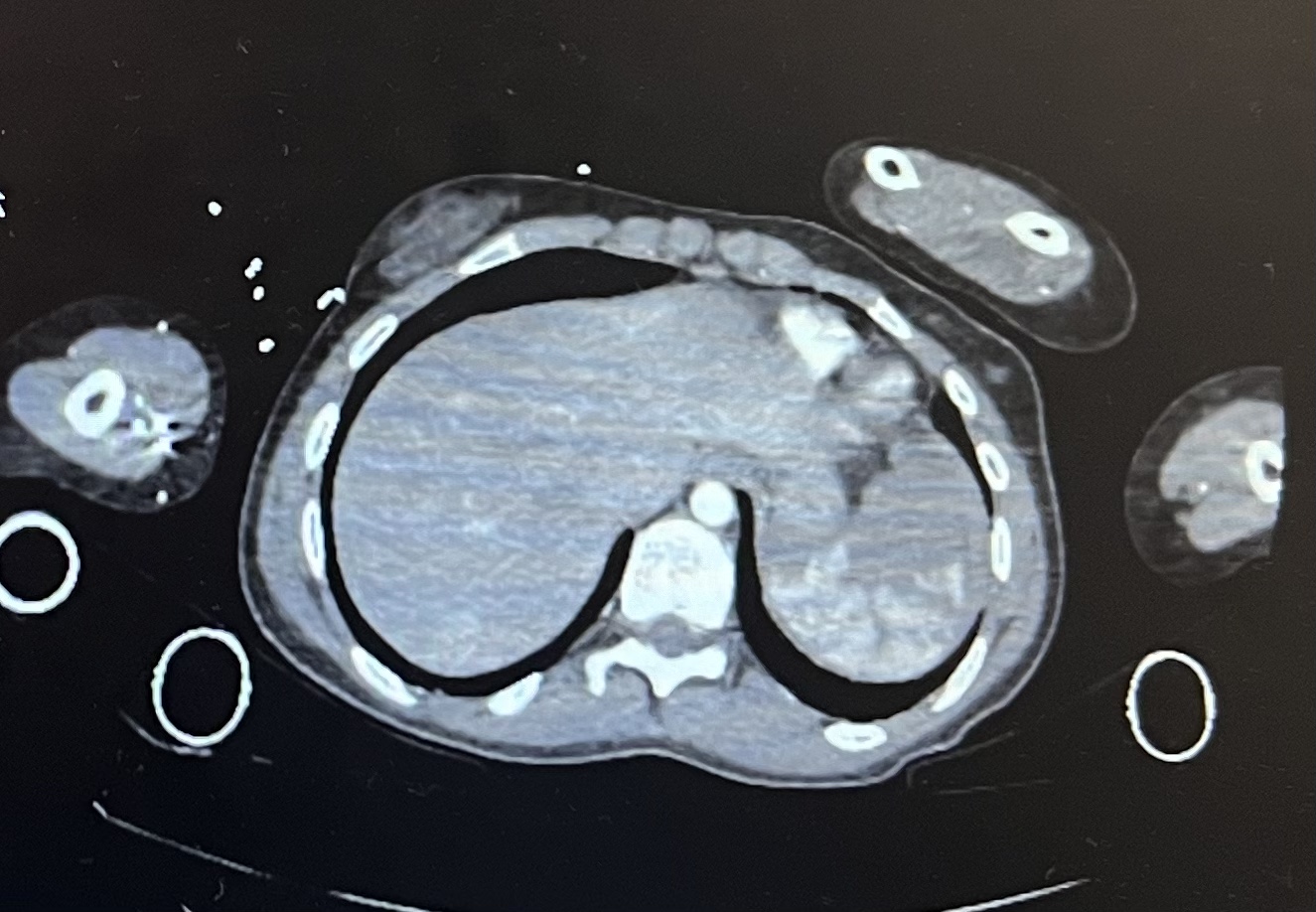 A pesar del buen estado general aparente, se realiza E-FAST detectándose líquido libre periesplénico y en saco Douglas en gran cuantía.