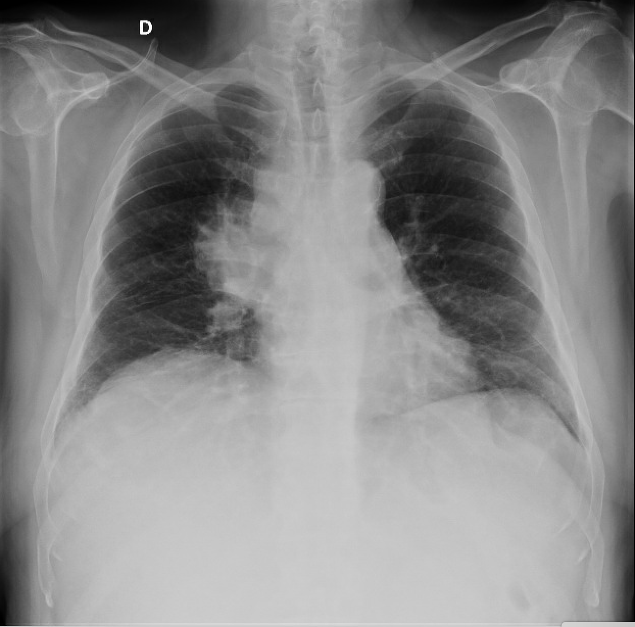 También se realiza radiografía de tórax donde se aprecia masa en región hiliar derecha.