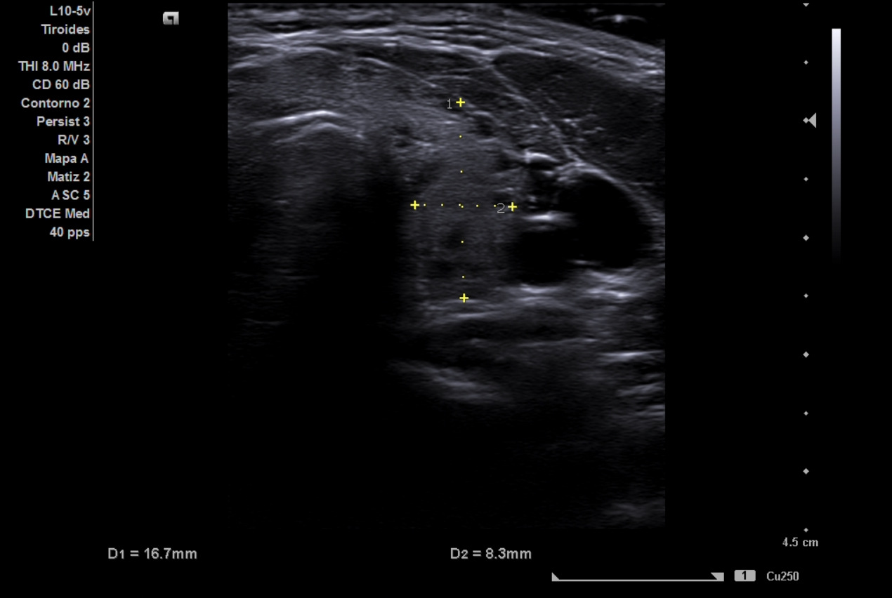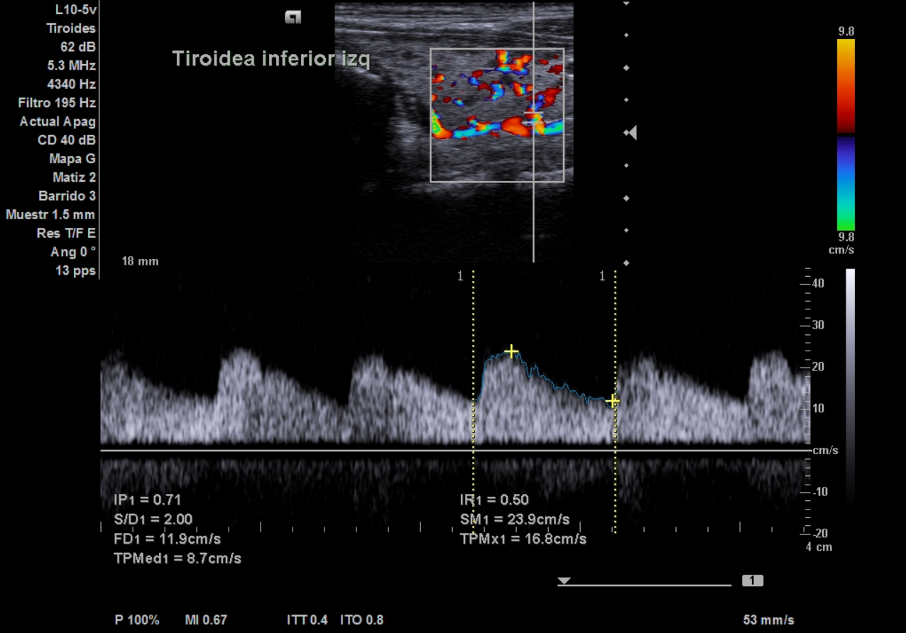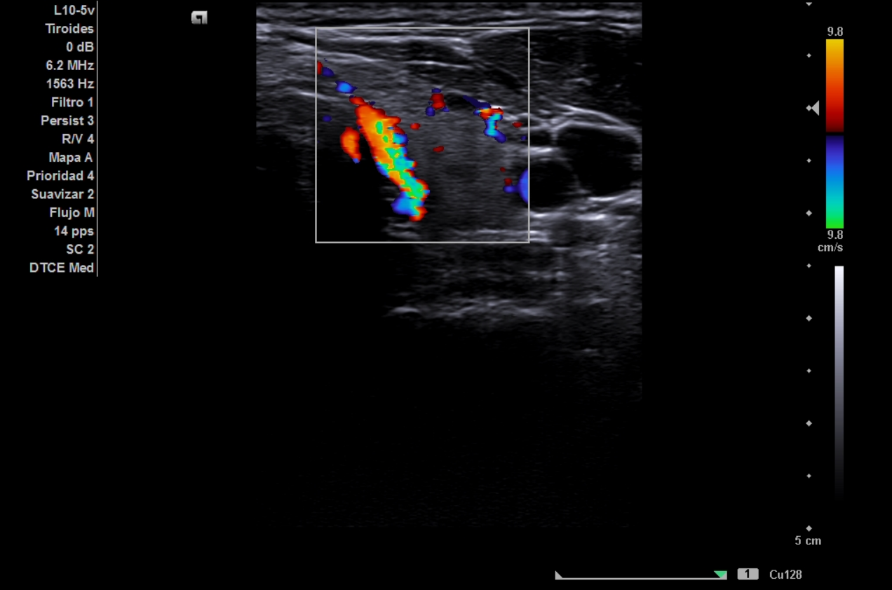 La ecografía clínica de tiroides muestra lóbulo derecho de 18 mm y lóbulo izquierdo de 16,7 mm en eje anteroposterior, con ecoestructura hipoecoica y heterogénea, presencia de múltiples quistes anecoicos milimétricos y un discreto aumento de la vascularización. No se identifican nódulos sólidos. El Doppler registra un pico sistólico máximo de 23 cm/s en ambas arterias tiroideas inferiores. Estos hallazgos son compatibles con tiroiditis.