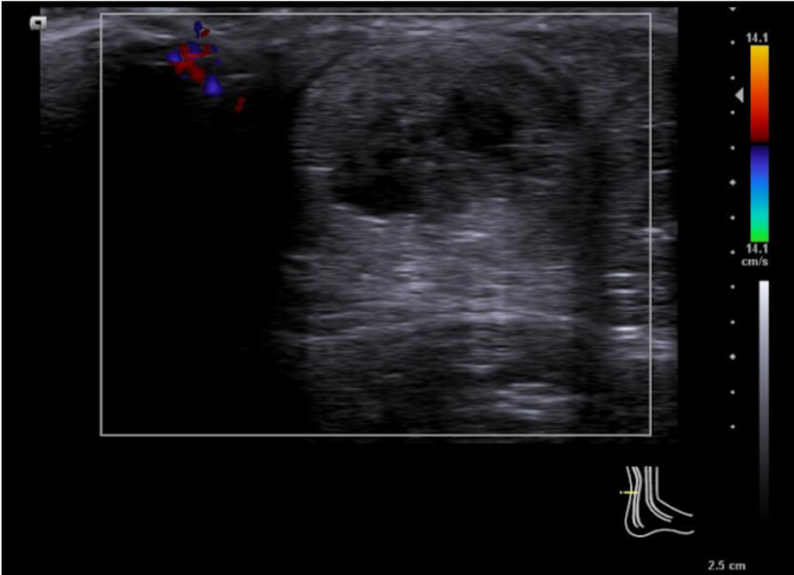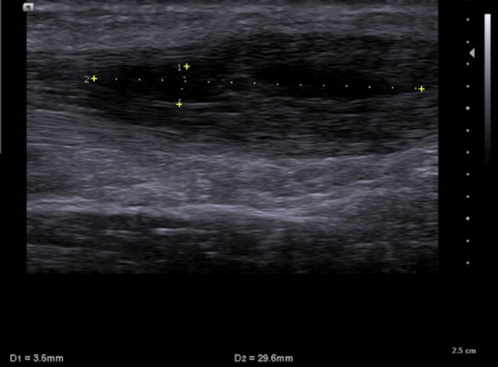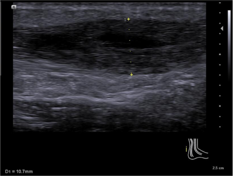 Se emplea sonda lineal L10-5v de forma longitudinal al tendón de aquiles, observando una zona anecoica en interfase del tendón a unos 7 cm de la inserción calcánea, con pérdida de continuidad del patrón fibrilar de las fibras tendinosas y aumento del grosor de este. No aumento de captación en Doppler.