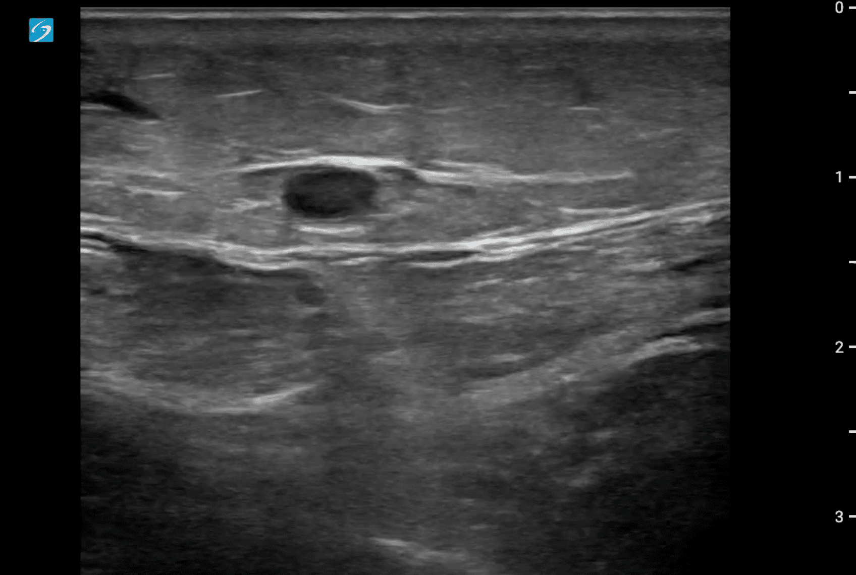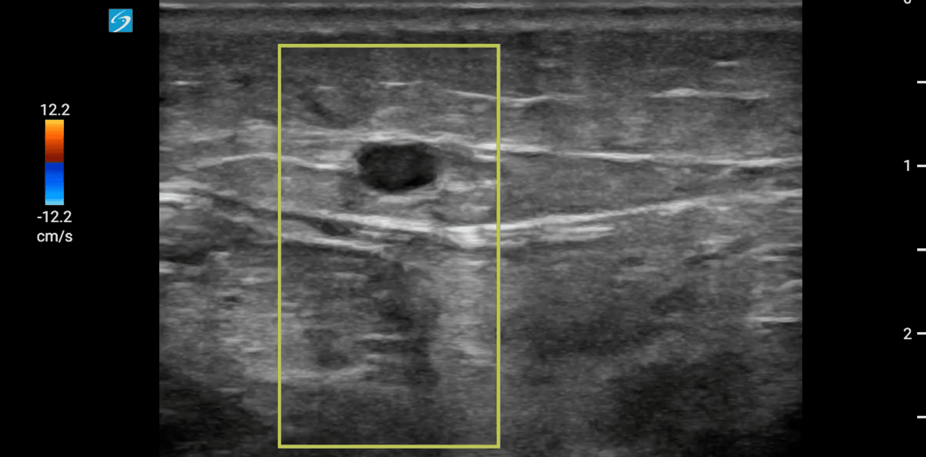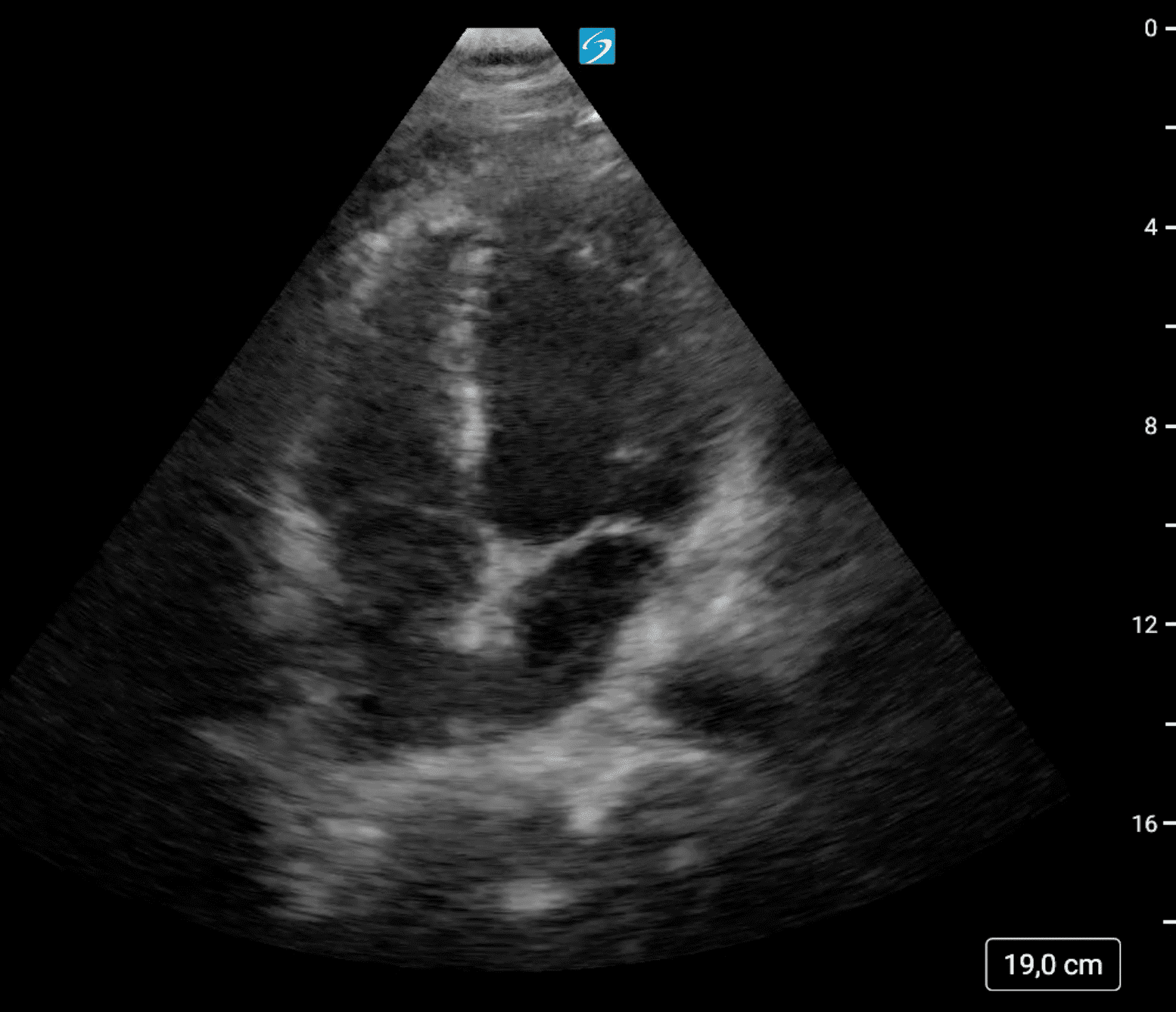Se localiza ecográficamente la vena femoral común con una imagen hipoecogénica que no colapsa con a la compresión y que se extiende por femoral superficial hasta poplítea. Tras hallazgos, se realiza también una ecografía cardíaca, con un diámetro de visu VD/VI < 1 y con una función cardíaca conservada, con resultado en escala PESI de riesgo bajo.