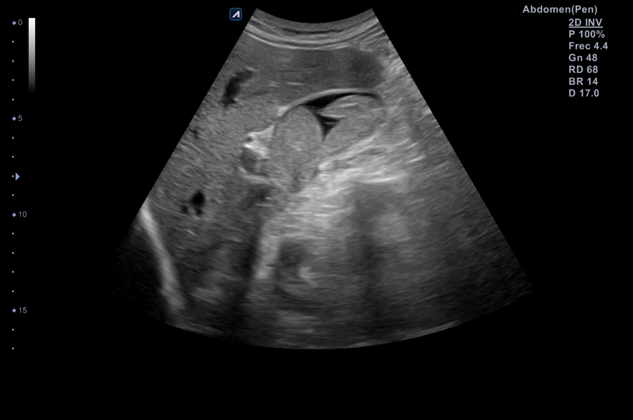 Varón de 74 años que presenta, diabetes mellitus tipo 2 y dislipemia. Además, angiodisplasia en ciego, gastritis crónica, divertículos en colon y déficit de vitamina B12 en relación con anemia perniciosa. En seguimiento por el hospital de día por anemia ferropénica rebelde a hierro oral. Intervenido de neoplasia vesical (cistectomía y tiene uréteres abocados a bolsa). A la exploración física presenta abdomen blando, timpánico, doloroso en hipocondrio derecho con Murphy dudoso.