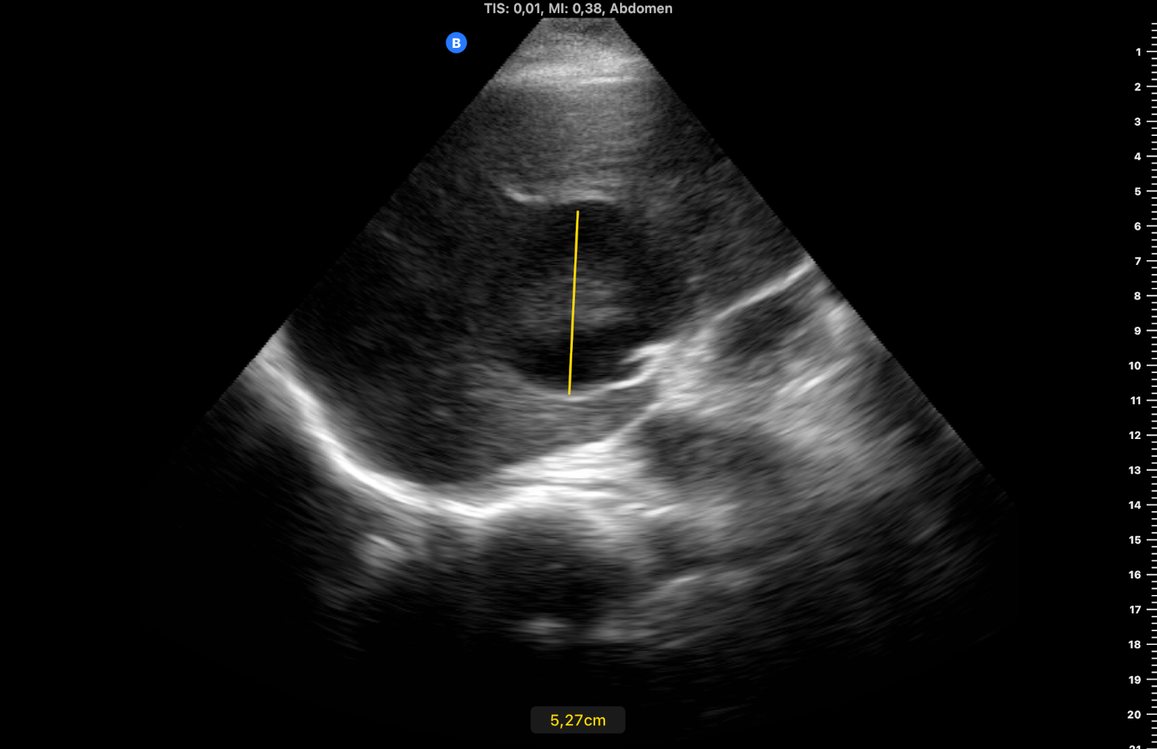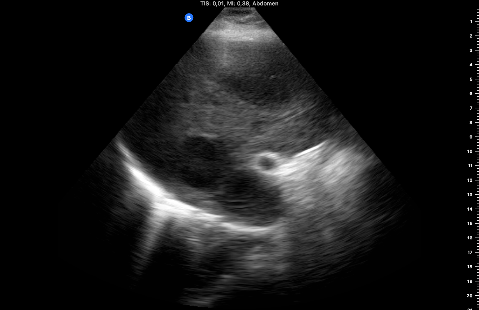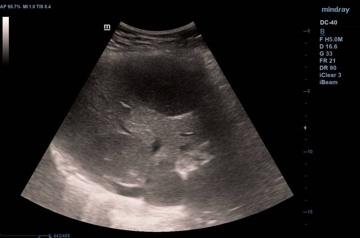 Mujer de 55 años sin antecedentes de interés. Usuaria habitual de sanidad privada hasta hace un año cuando acudió para baja laboral. Refirió alteración de la sensibilidad en dedos de manos y pies, después en brazos con pérdida de fuerza. Tras estudio por neurólogos privados (biopsias, analíticas, EMG, RM, TC…), se diagnosticó de polineuritis por posible vasculitis y fue tratada con bolos de corticoides y gabapentina que condicionaron mermas cognitivas. Un año después seguía sin diagnóstico claro y había sido remitida a Neurología de hospital público, donde se inició tratamiento con inmunosupresores. Última analítica hace 4 meses con GGT 250, resto normal. Refiere que en la última semana se encuentra mucho más cansada. Se pide analítica tras cuyos resultados se realiza ecografía.