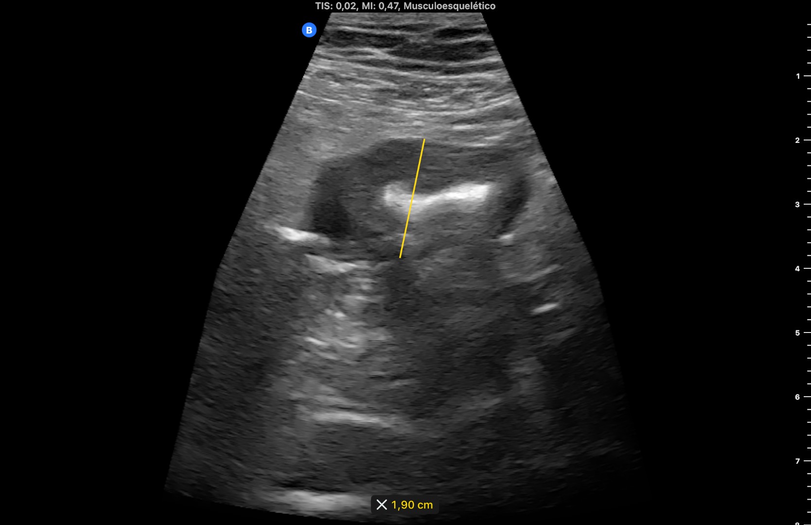 Hallazgos ecográficos: Se objetiva imagen de tubo digestivo a nivel sigmoideo, con engrosamiento de pared que alcanza los 1,9 cm de diámetro (fotos 1 y 2) y que sugiere diverticulitis aguda (hay vídeo).