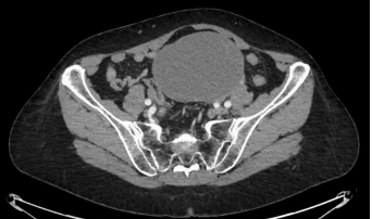 SolicitanTAC abdominal que evidencia gran masa pélvica de origen anexial izquierdo, de unos 12 centímetros, de predominio quístico, compatible con tumor ovárico epitelial (tumor borderline o adenocarcinoma mucinoso/seroso). Sin evidencia de diseminación adenopática o a distancia).