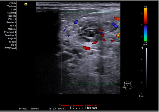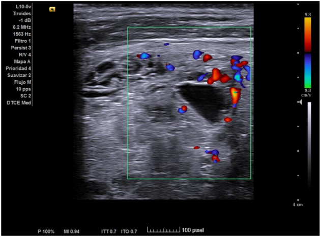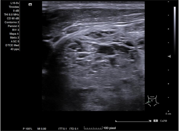 Ecografía clínica de tiroides: Glándula tiroides muy aumentada de tamaño. Istmo irregular de 20 mm. Lóbulos tiroideos desestructurados, aumentados de tamaño (siendo mayor el derecho) y presencia de múltiples nódulos, algunos anecogénicos y otros de estructura espongiforme. No se aprecia aumento de vascularización con modo Doppler que descarta situación de tormenta tiroidea.