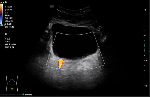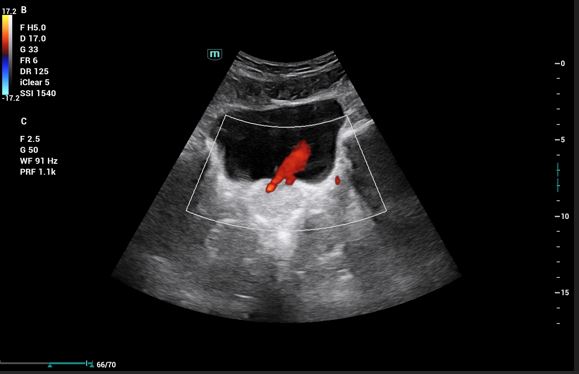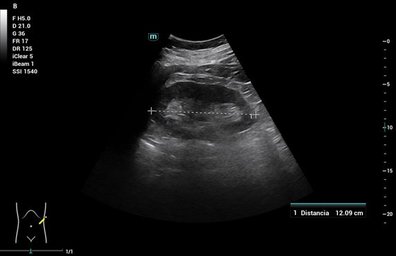 Pruebas complementarias: Sistemático de orina: microhematuria y ecografía abdominal: Riñones: (RD 11 cm, RI 12,09 cm), ecogenicidad, contornos y localización normales. RD: dilatación de la vía excretora Grado I dudosas imágenes de litiasis sin sombra acústica. No se evidencia líquido libre intrabdominal. Vejiga bien replecionada, jet ureteral bilateral simétrico, en trayecto del uréter derecho con Doppler color se observa artefacto de centelleo o efecto twinkling, que sugiere cálculo enclavado en unión vesicoureteral derecha.