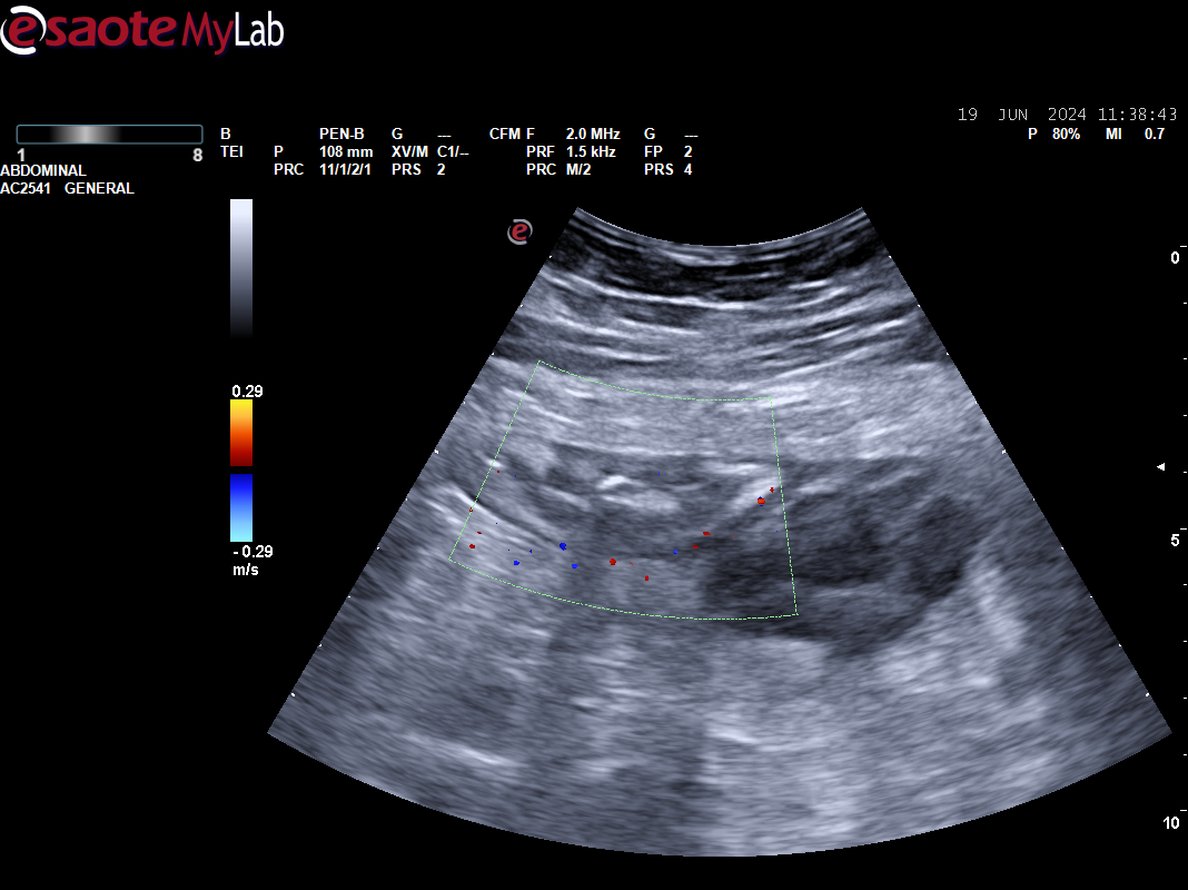 Paciente 2: vesícula distendida sin ecos en su interior, en línea media detectamos masa redondeada de 3-4 cm, Doppler positivo bajo proceso uncinado, dado dolor intenso no controlado se remite a urgencias e ingresa para estudio de posible masa pancreática.