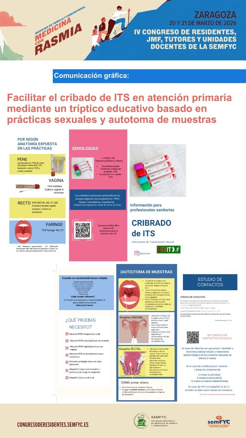 La comunicación gráfica presentada constituye una herramienta práctica y accesible para mejorar el cribado de ITS en atención primaria. Al basarse en prácticas sexuales y no en identidades o supuestos de riesgo, contribuye a reducir prejuicios, mejorar la comunicación clínica y favorecer una atención más equitativa y centrada en la persona.