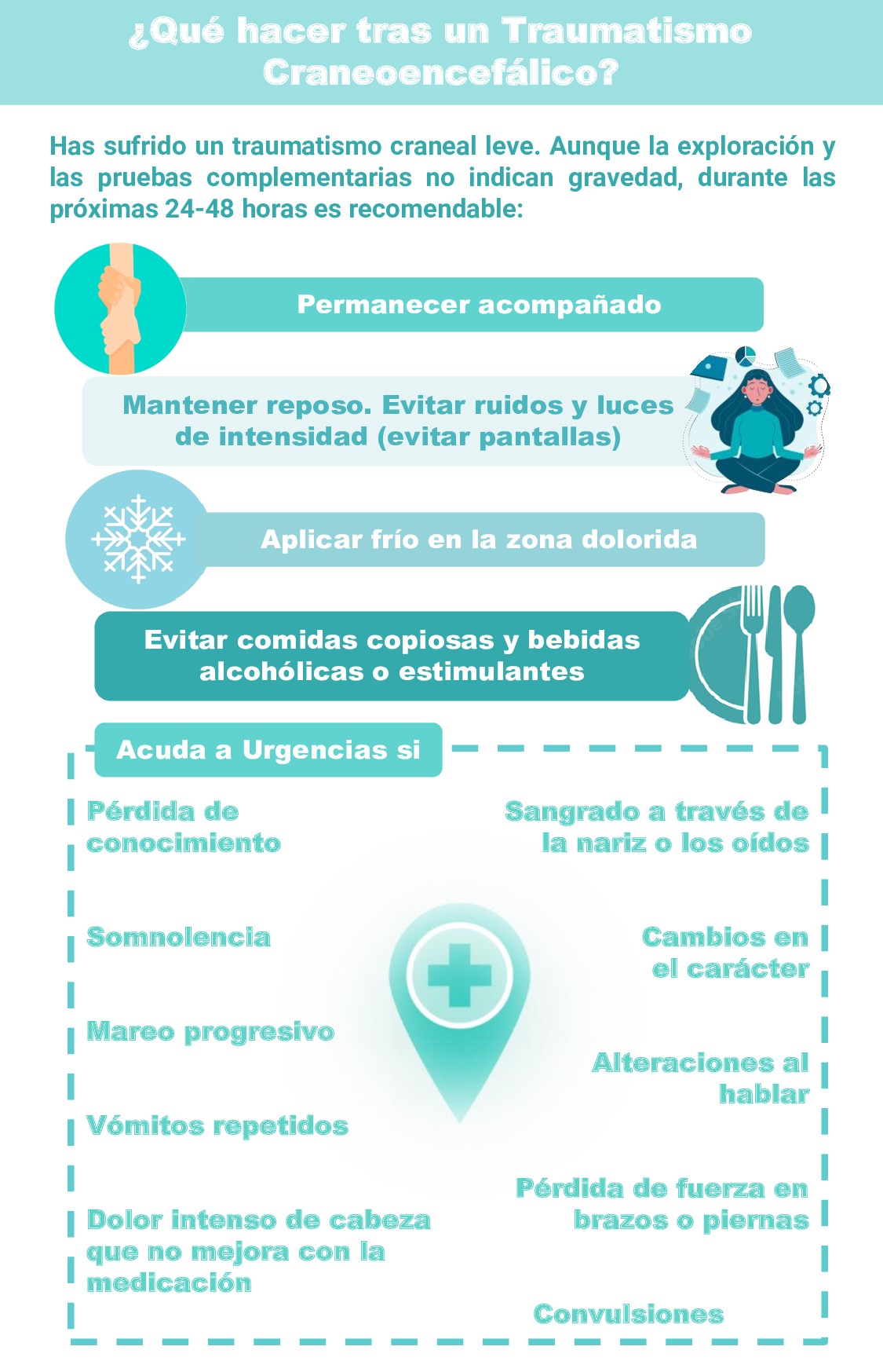 El traumatismo craneoencefálico leve es un motivo frecuente de consulta, especialmente en servicios de Urgencias. A pesar de que no suele conllevar más problemas que el propio traumatismo, en ocasiones pueden aparecer complicaciones y consecuencias posteriores que pasan desapercibidas por falta de vigilancia o adecuado tratamiento. Es por ello que las 24-48 horas posteriores al trauma son vitales para prevenir mayores problemas. Se recomienda a los pacientes: