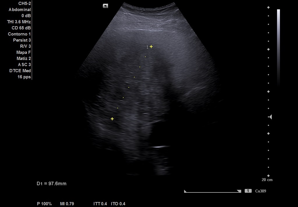 Ante exploración anodina realizamos ecografía abdominal con sonda convex.